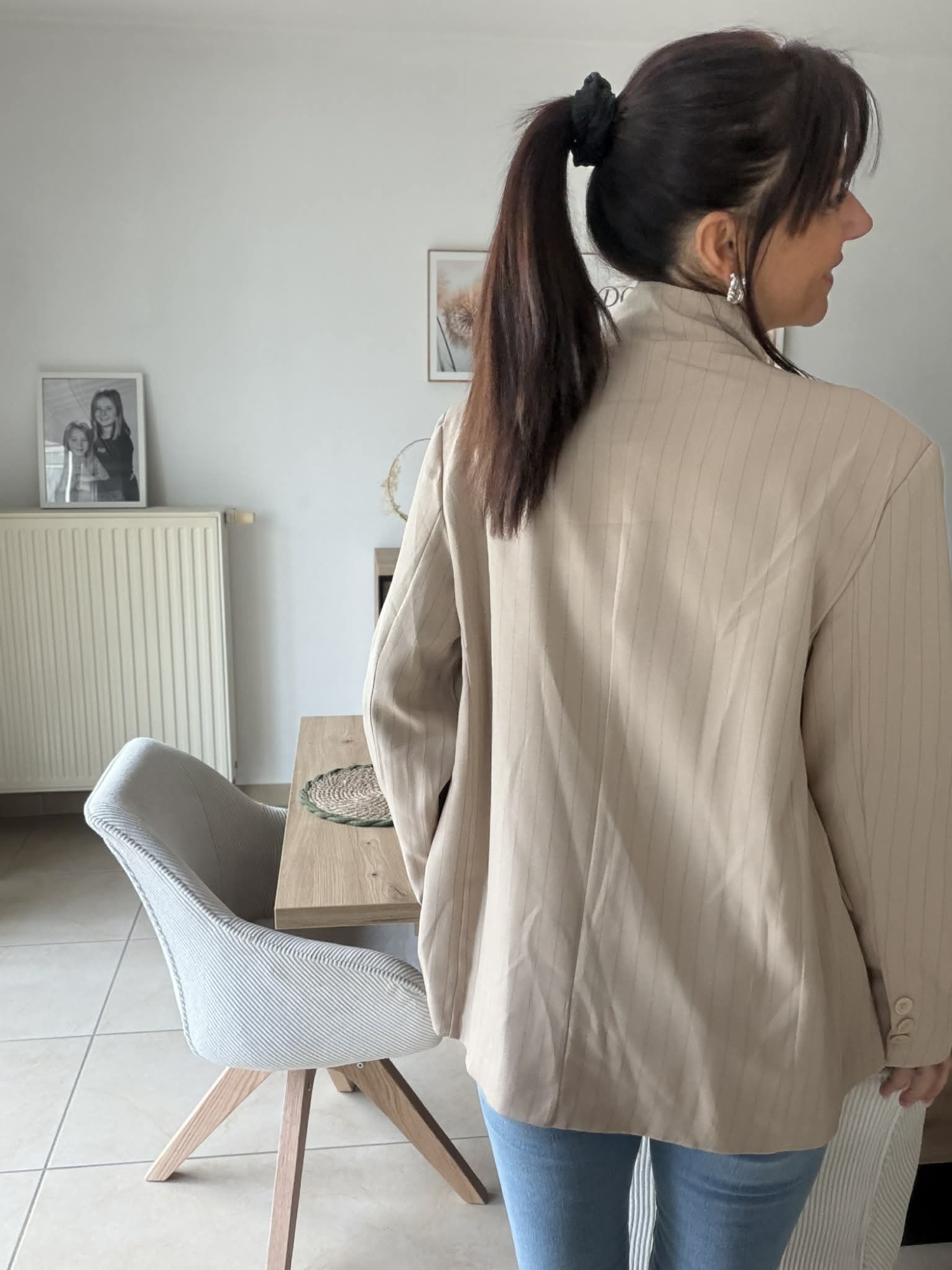 Ce blazer à fines rayures revisite l’élégance classique avec beaucoup de modernité. Sa coupe structurée apporte une belle tenue à la silhouette, tout en gardant une allure fluide et raffinée. Le col travaillé et la fermeture croisée lui donnent un côté sophistiqué, idéal pour composer une tenue chic sans en faire trop.
