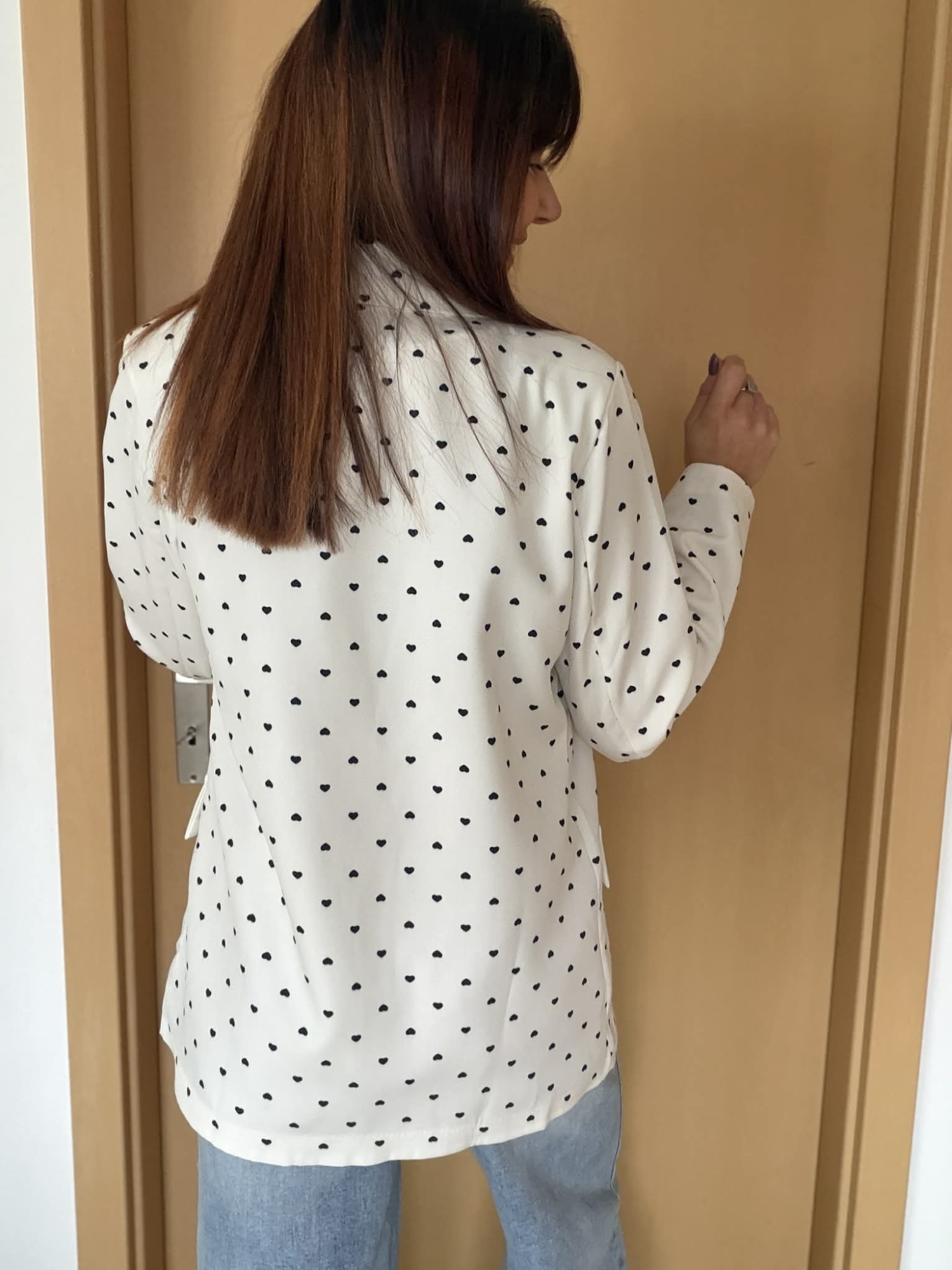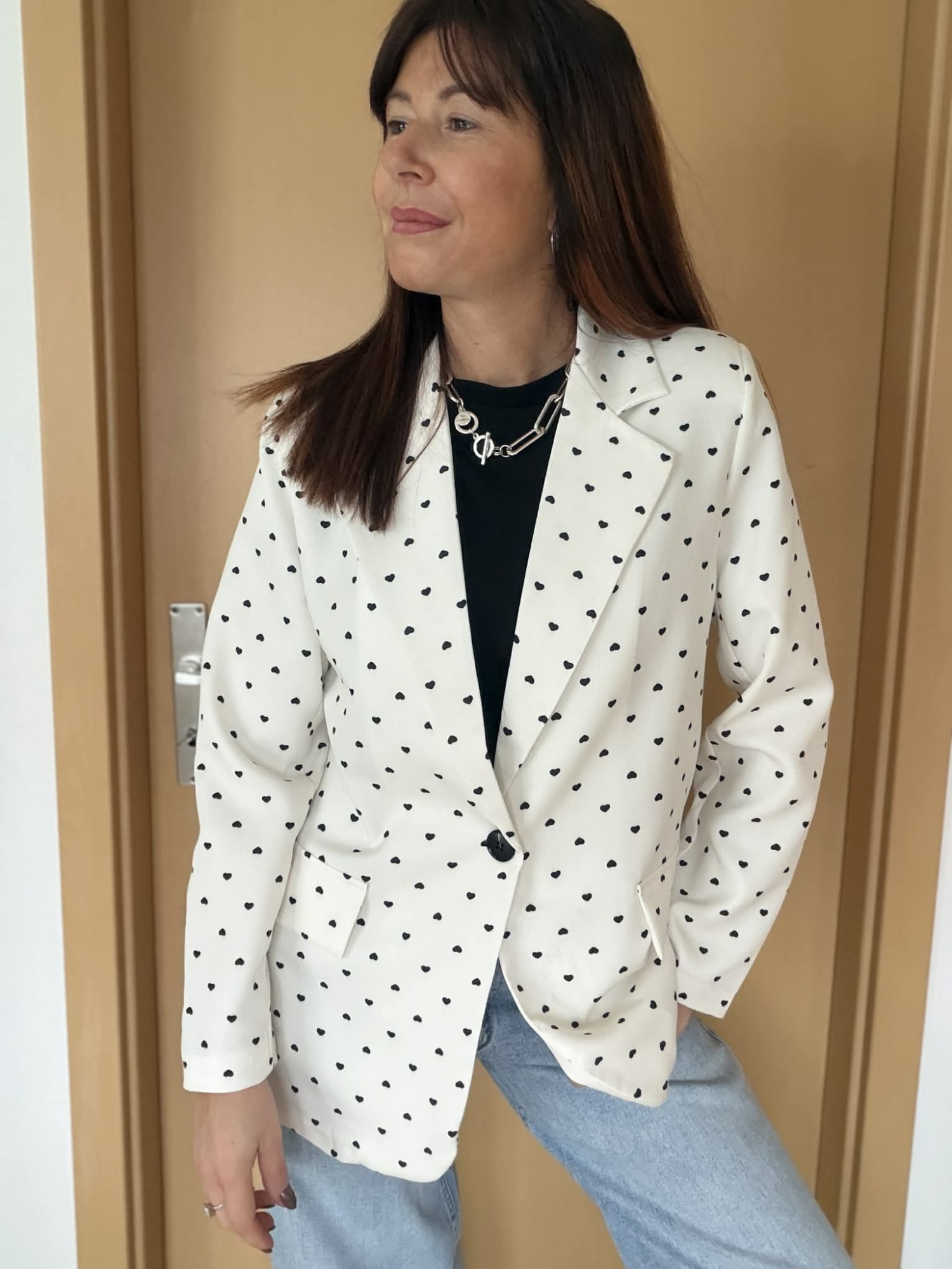 Blazer blanc cassé à petits cœurs noirs, à la fois chic, original et facile à porter. On adore sa coupe fluide et légèrement oversize qui structure la silhouette sans la rigidifier. Il est doté d’un joli col tailleur, d’une fermeture à un bouton noir et de poches à rabat pour une finition élégante.