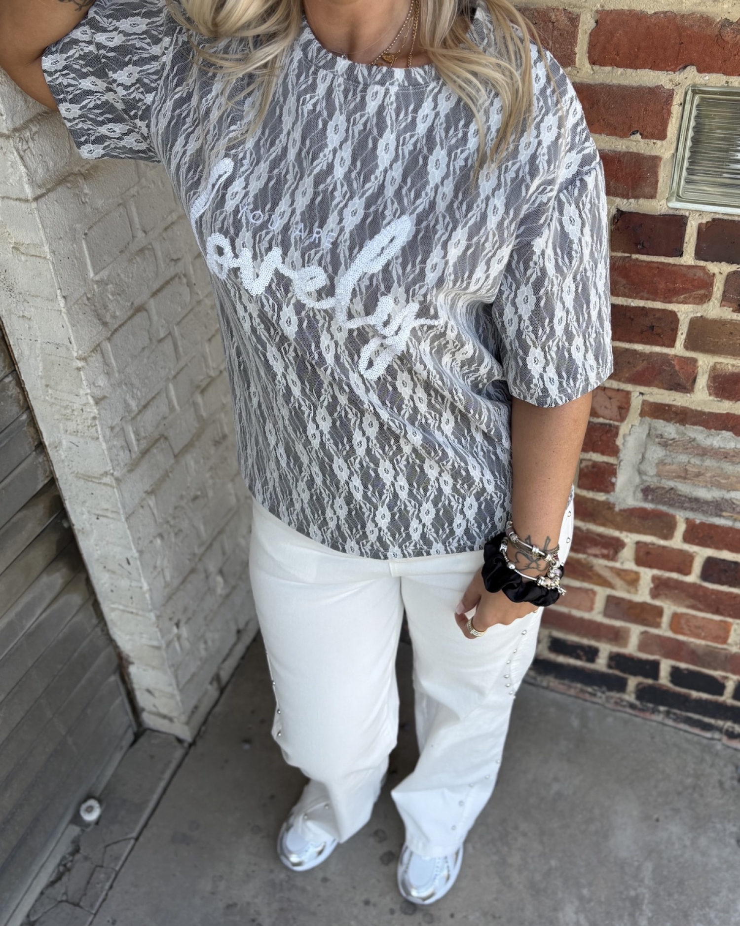 T-shirt en dentelle à l’allure féminine et originale, avec une coupe droite légèrement ample, manches courtes et col rond classique. Son jeu de transparence lui apporte beaucoup de caractère, tandis que l’inscription sur l’avant ajoute une touche mode et moderne. Une pièce facile à porter pour donner du style à une tenue tout en restant légère et tendance.