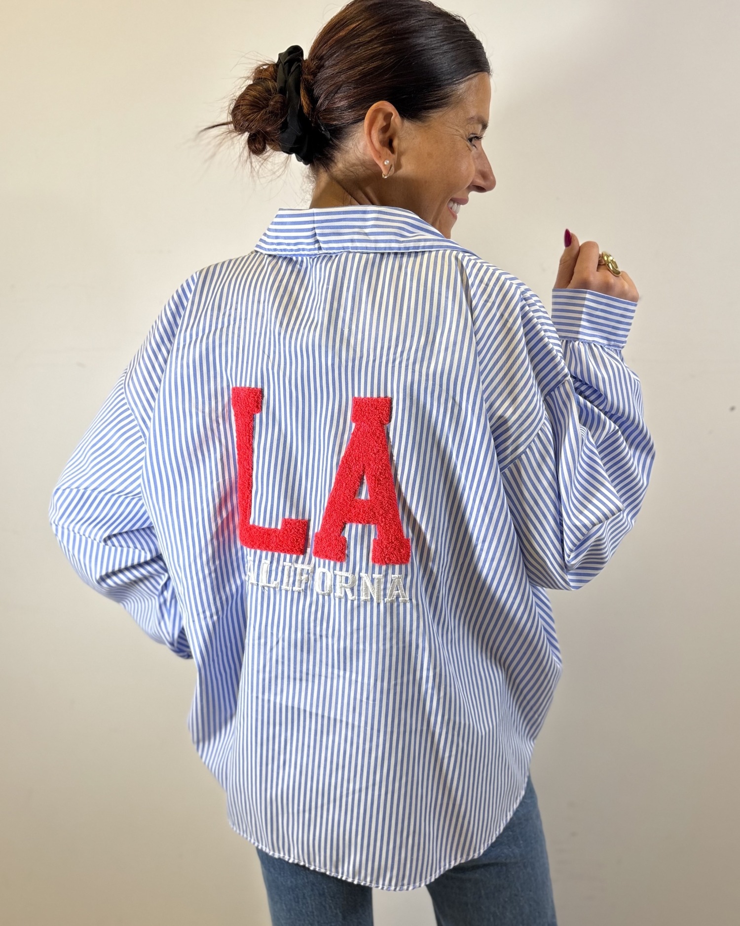 La pièce se distingue par ses broderies texturées “LA California”, positionnées en plus petit sur la poitrine et en version grand format dans le dos, apportant un esprit casual inspiré du style universitaire et un caractère fort à la chemise.