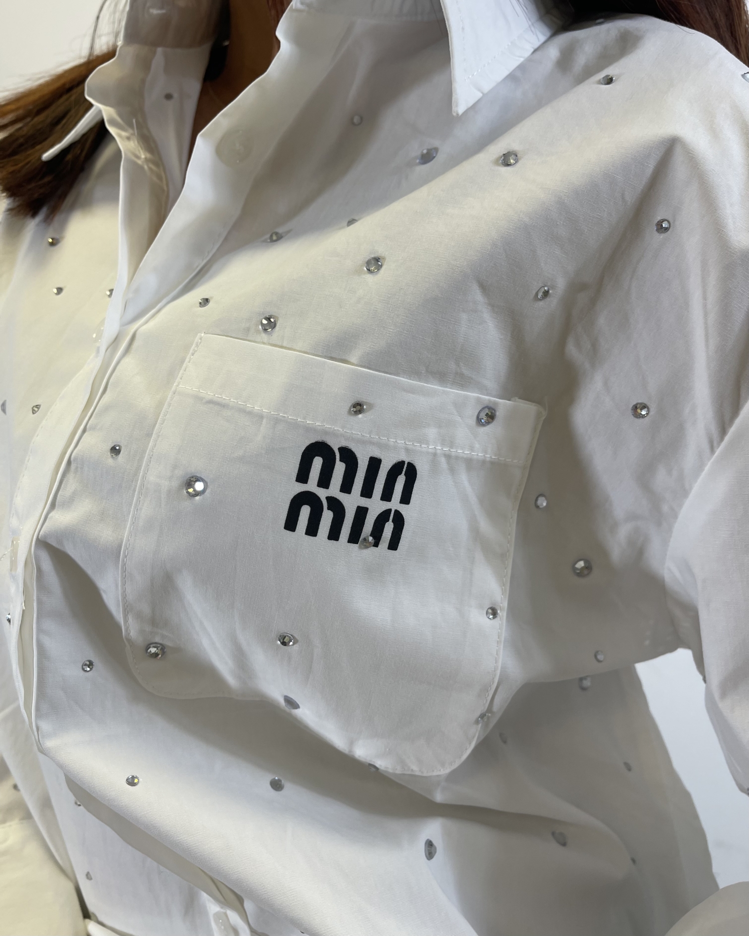 Chemise à la coupe droite et légèrement ample, offrant un style à la fois chic et décontracté. Elle est dotée d’un col classique, d’une fermeture boutonnée sur toute la longueur et d’une poche poitrine structurée qui apporte une touche moderne. Le tissu est subtilement orné de petits détails brillants répartis sur l’ensemble, ajoutant une note lumineuse et élégante tout en restant facile à porter au quotidien.
