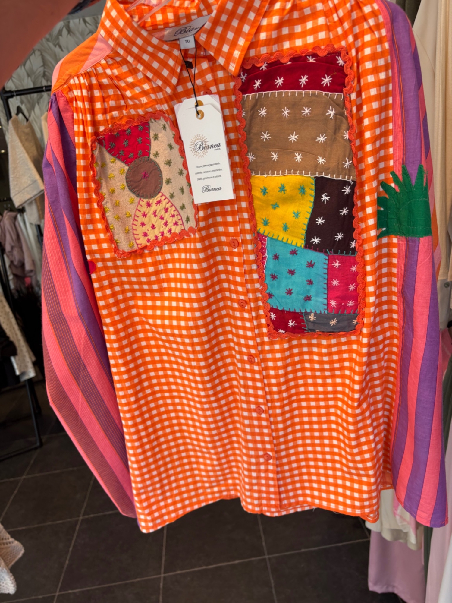 Blouse originale et pleine de pep’s, au style bohème artistique. Elle associe un motif vichy sur le devant à des manches rayées très colorées, pour un effet patchwork audacieux et lumineux. Les détails brodés et les empiècements décoratifs sur la poitrine lui apportent beaucoup de caractère. Avec sa coupe fluide, son col chemise et son esprit créatif, c’est une pièce forte qui dynamise instantanément une tenue.