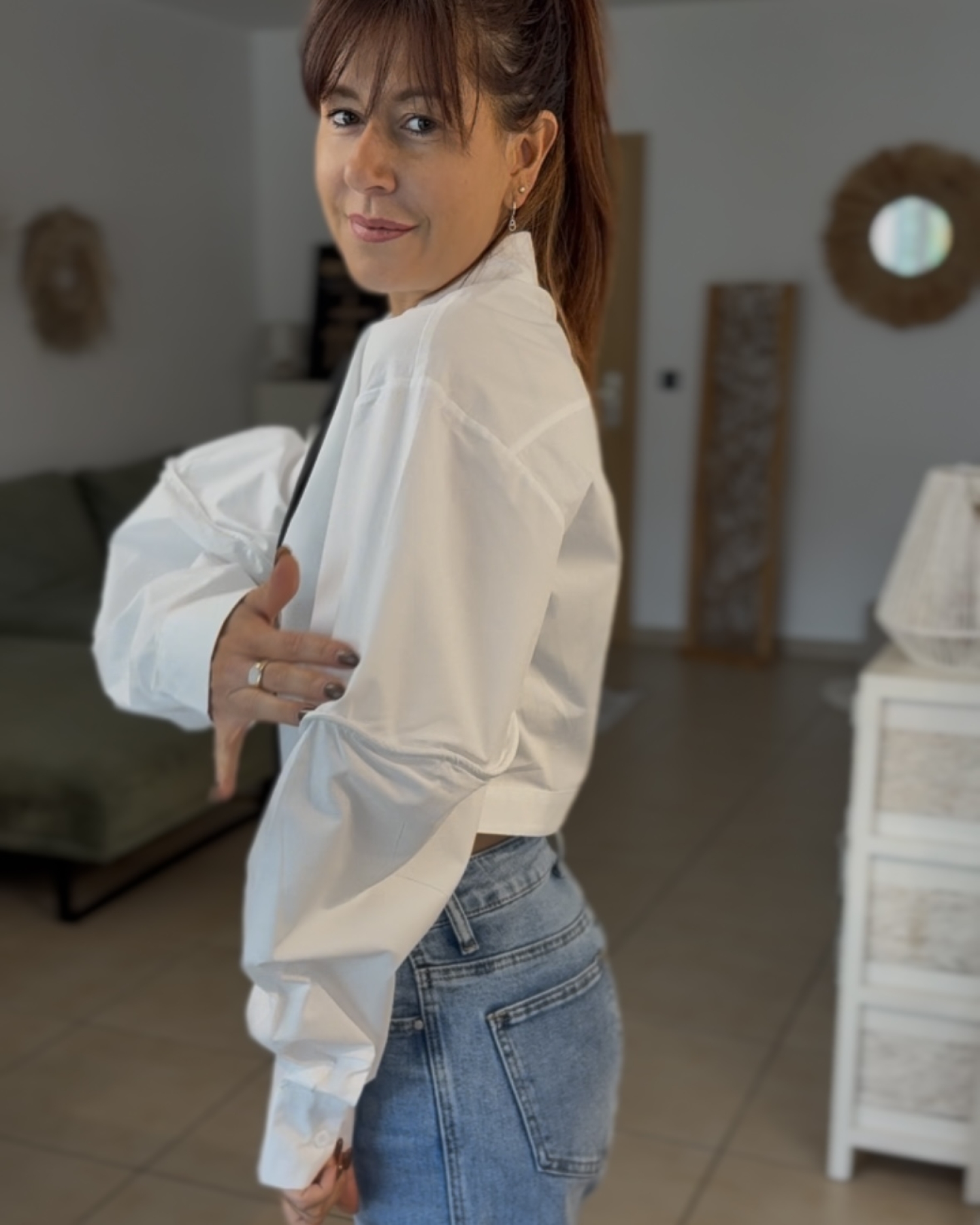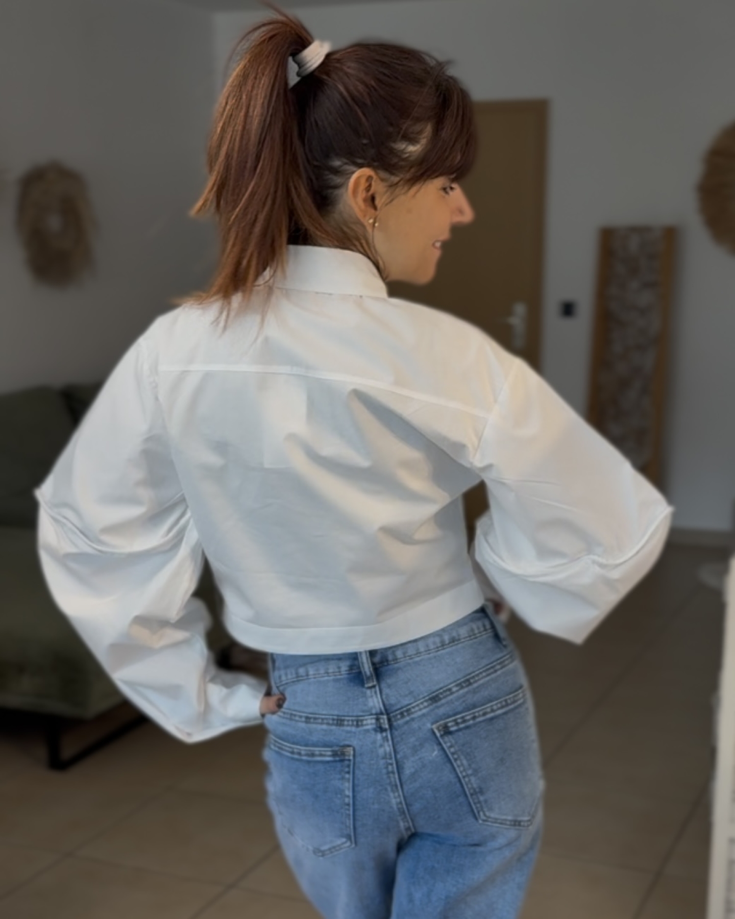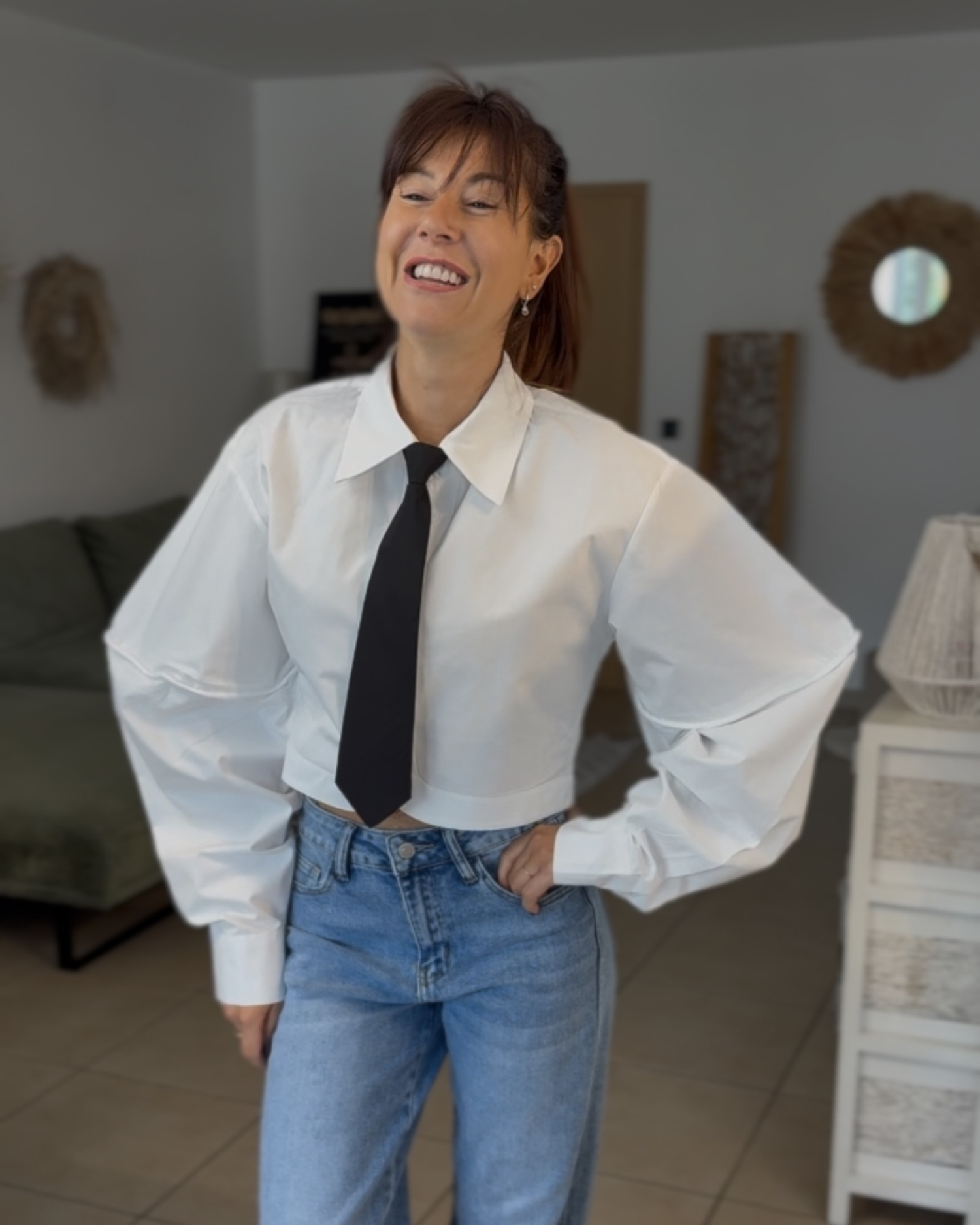 Ce chemisier revisite la chemise classique avec une coupe courte très tendance et structurée. Il se distingue par son grand col marqué, sa fermeture boutonnée sur le devant et sa cravate intégrée qui lui donne une allure chic et affirmée. Les manches sont longues, volumineuses et légèrement bouffantes, avec un joli effet de matière et de volume tout le long du bras. La base est raccourcie et bien nette, ce qui met la silhouette en valeur et apporte une touche moderne à l’ensemble.