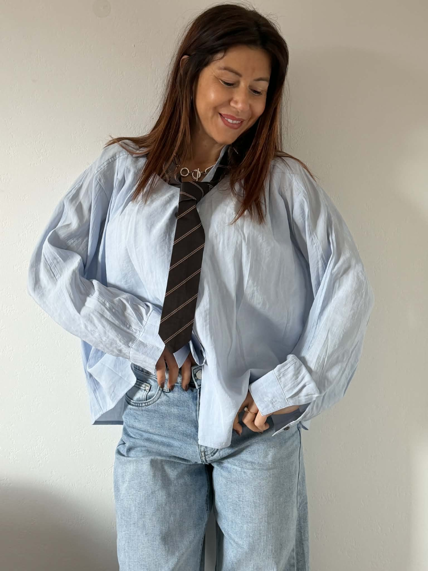 Chemise bleu ciel à la coupe oversize, parfaite pour un look à la fois tendance, décontracté et ultra stylé. On aime sa matière légère, son tombé fluide et ses manches longues larges qui apportent beaucoup d’allure à la silhouette.