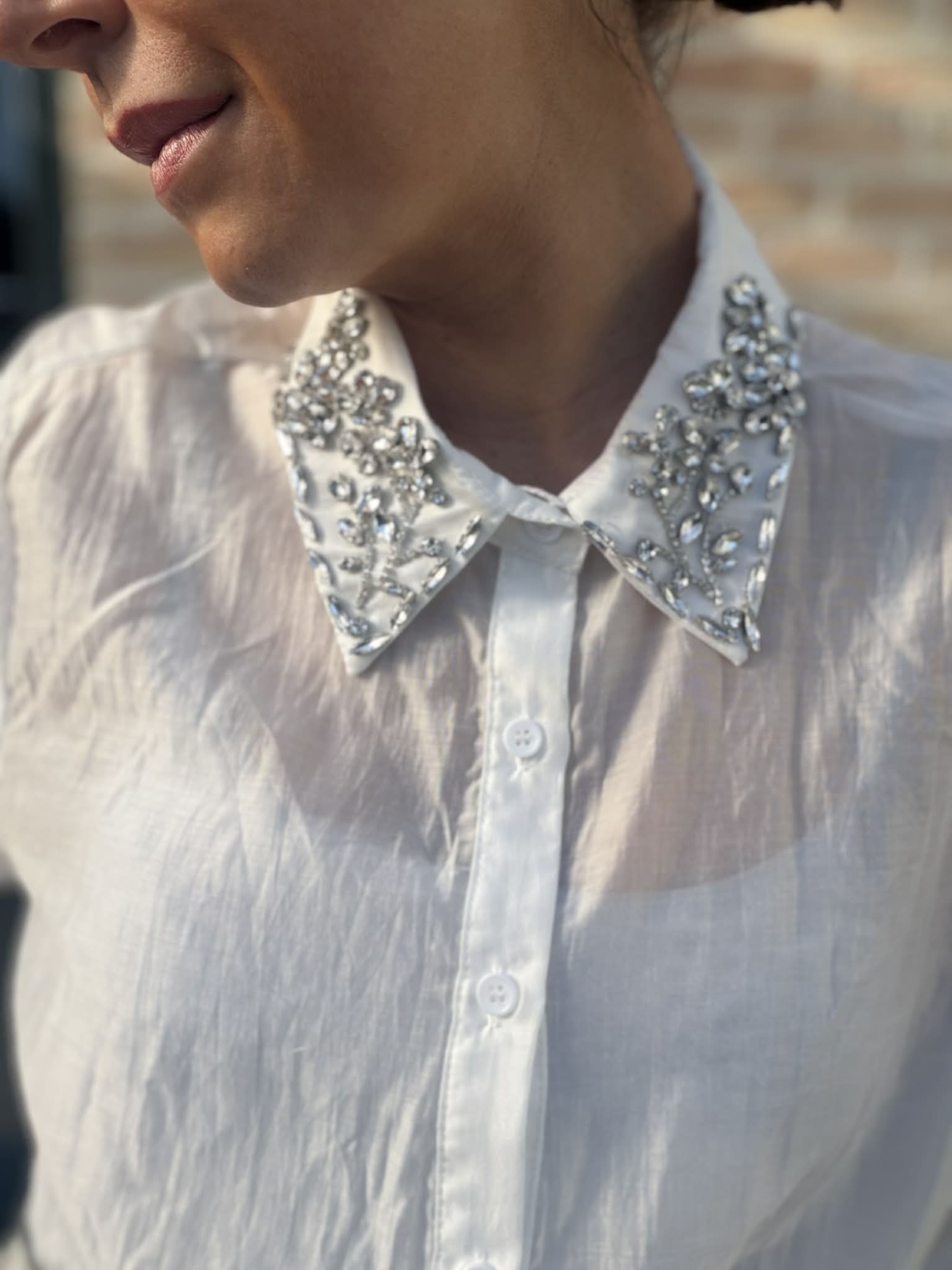 Cette chemise blanche revisite l’élégance classique avec une touche très raffinée. Sa matière légère et légèrement transparente lui donne un rendu aérien et féminin, tandis que sa coupe fluide apporte beaucoup de douceur au tombé.