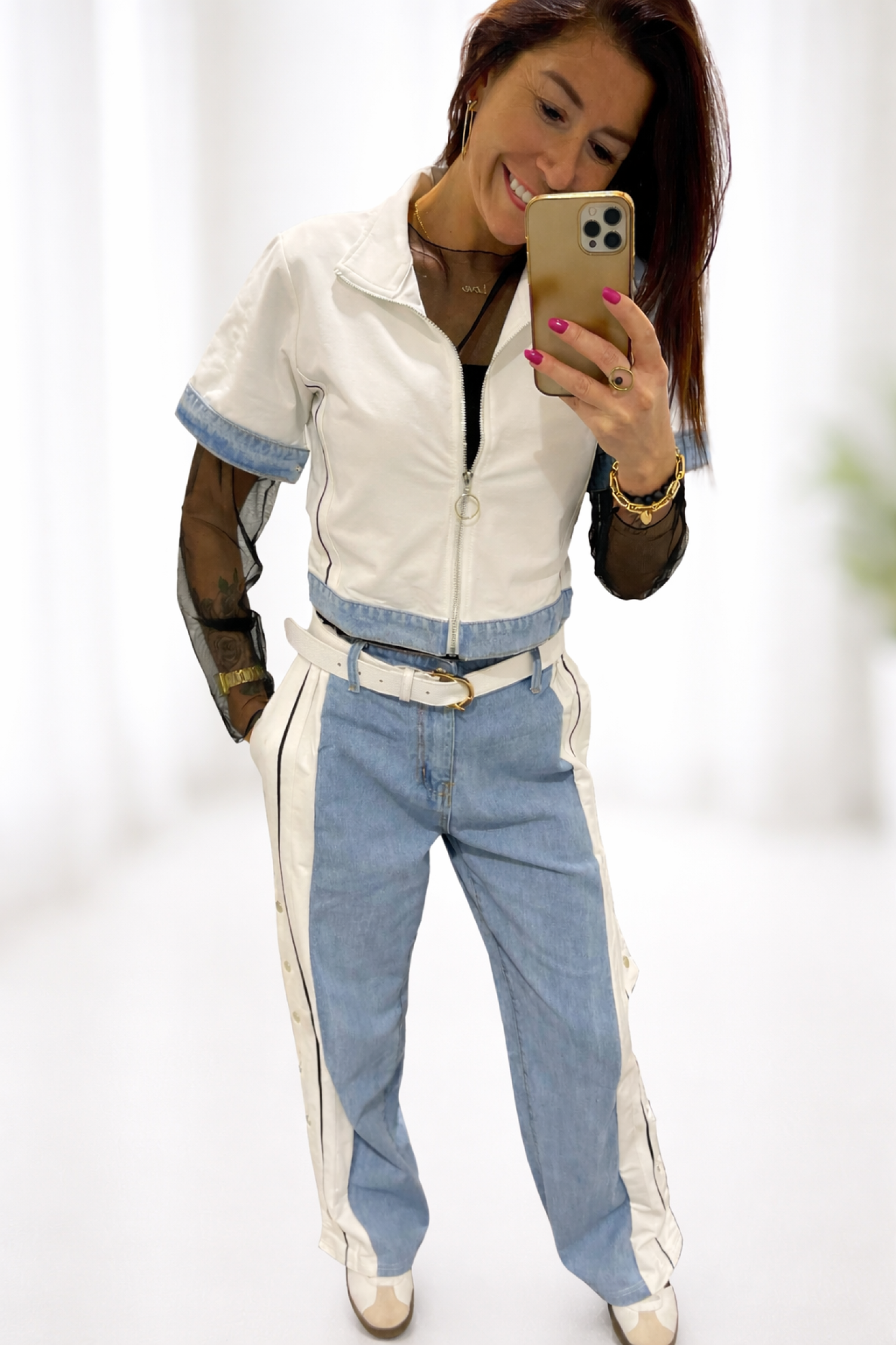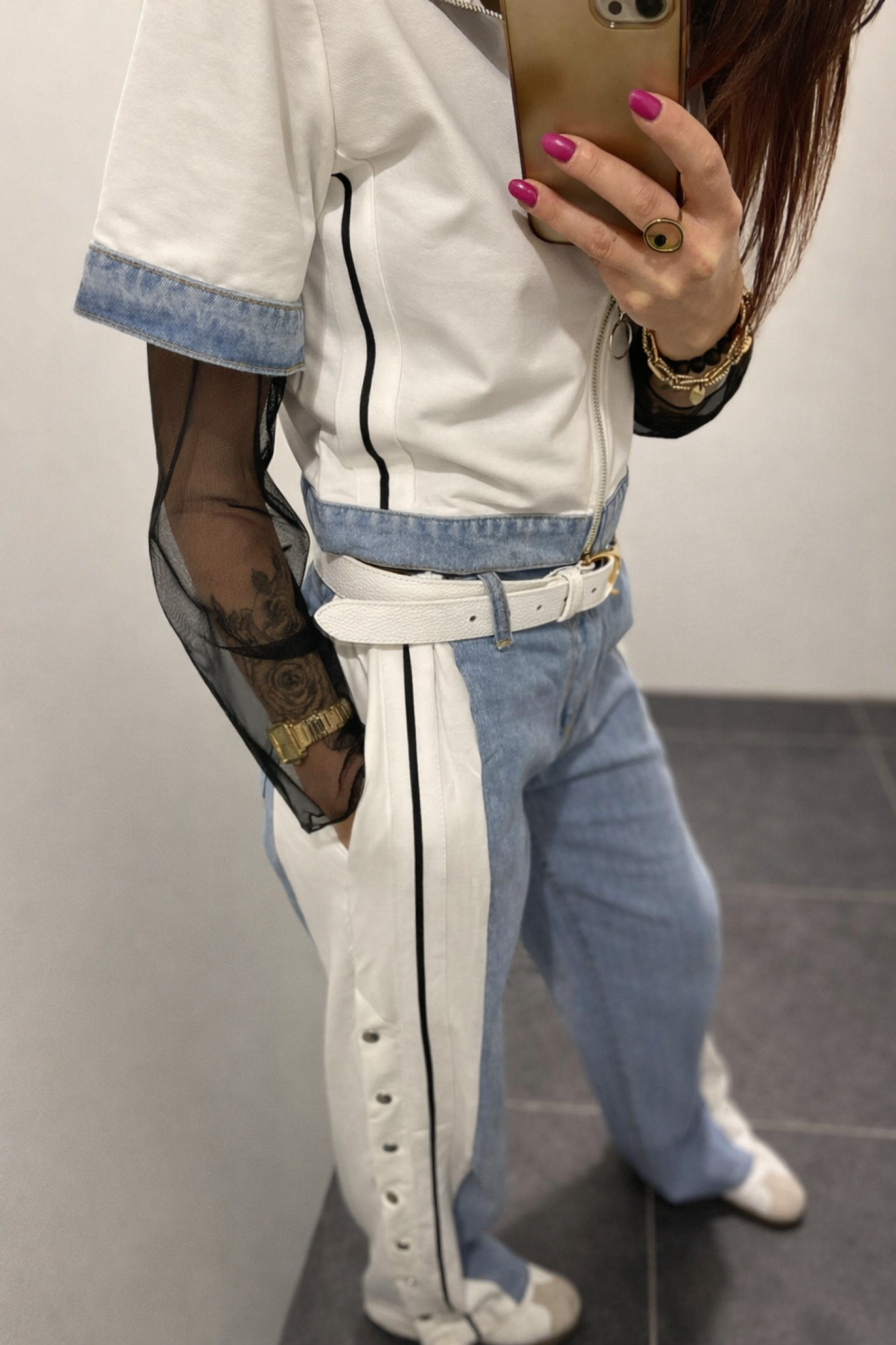 Le pantalon assorti mêle harmonieusement blanc et jean clair pour un rendu tendance et confortable. Sa taille ceinturée souligne la silhouette tandis que les détails pressionnés sur le côté ajoutent une note mode originale. Un ensemble à la fois pratique et stylé, idéal pour un look urbain maîtrisé au quotidien.
