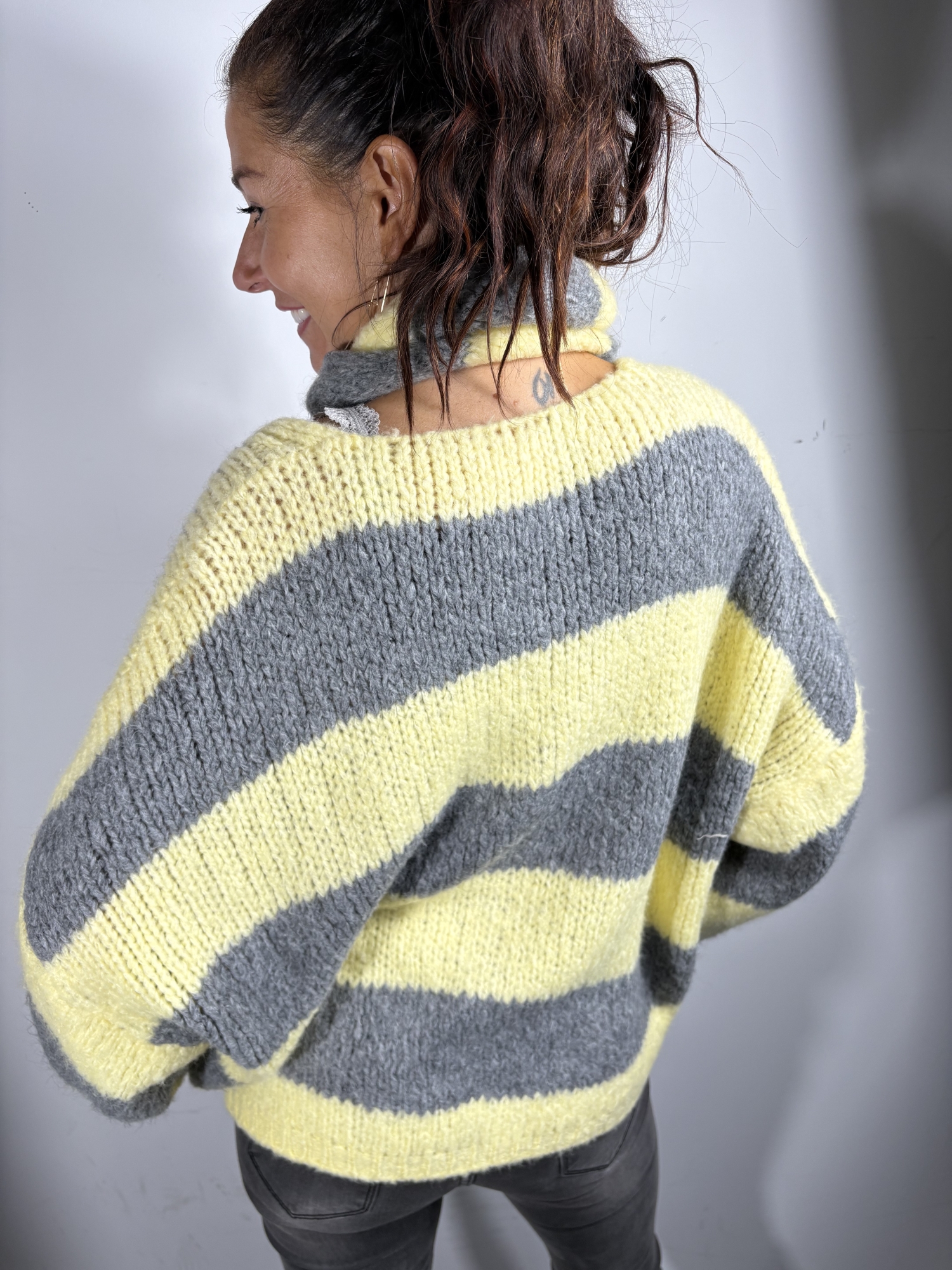 Ce pull séduit par son style cosy et tendance, parfait pour apporter du caractère à une tenue du quotidien. Il est accompagné de son écharpe assortie, non attachée, permettant de varier les styles selon les envies.