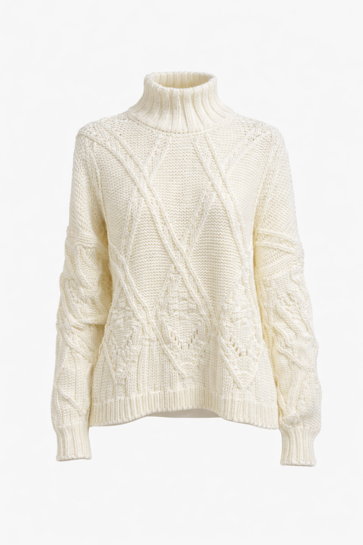 Pull en maille épaisse avec motif torsadé et col roulé.