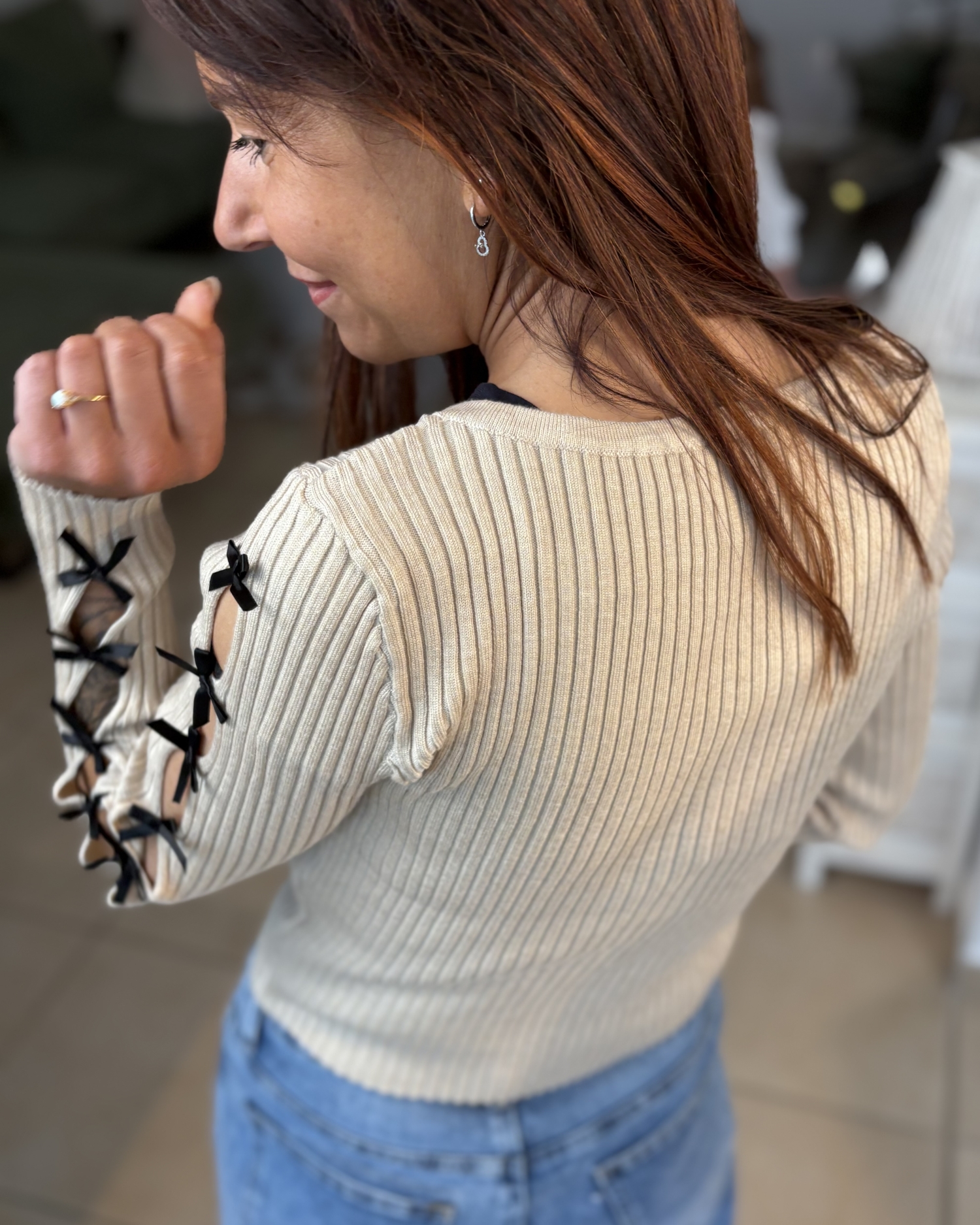 Pull fin en maille côtelée, près du corps, avec une encolure large et féminine. Son détail signature se trouve sur les manches ajourées, sublimées par une succession de petits nœuds qui apportent une touche délicate et originale. Un modèle élégant et raffiné, parfait pour féminiser une tenue tout en gardant un esprit moderne.