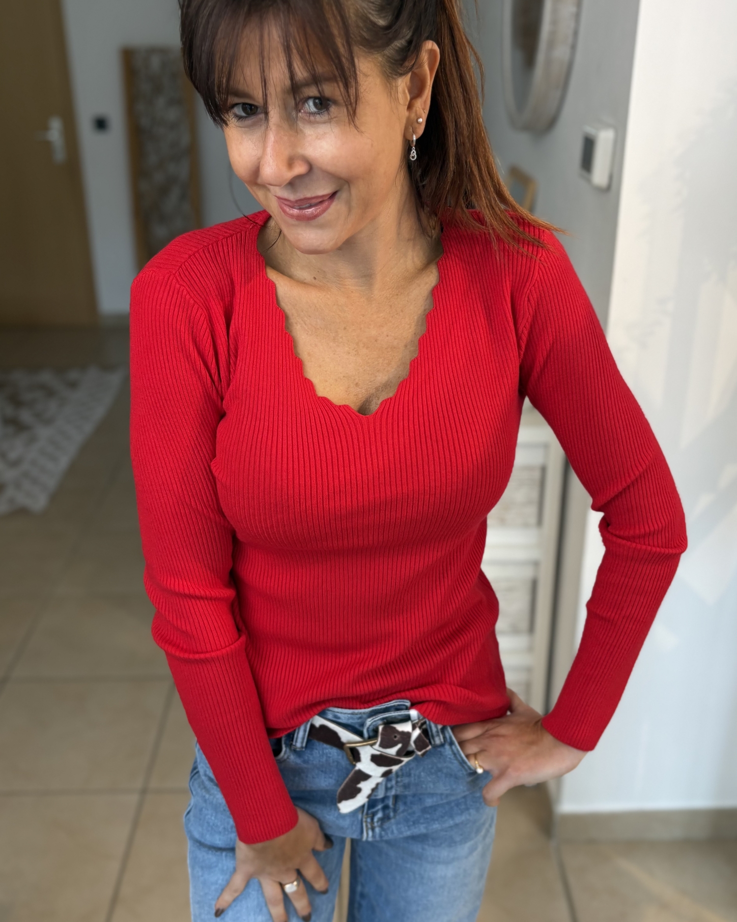 Pull en maille fine côtelée, à la coupe près du corps, qui épouse joliment la silhouette tout en restant confortable. Il se distingue par son col en V délicatement festonné, qui apporte une touche féminine et raffinée. Les manches longues et la finition sobre en font une pièce facile à porter au quotidien, aussi bien avec un jean qu’avec une tenue plus habillée. Un basique élégant, rehaussé par un joli détail au niveau de l’encolure.