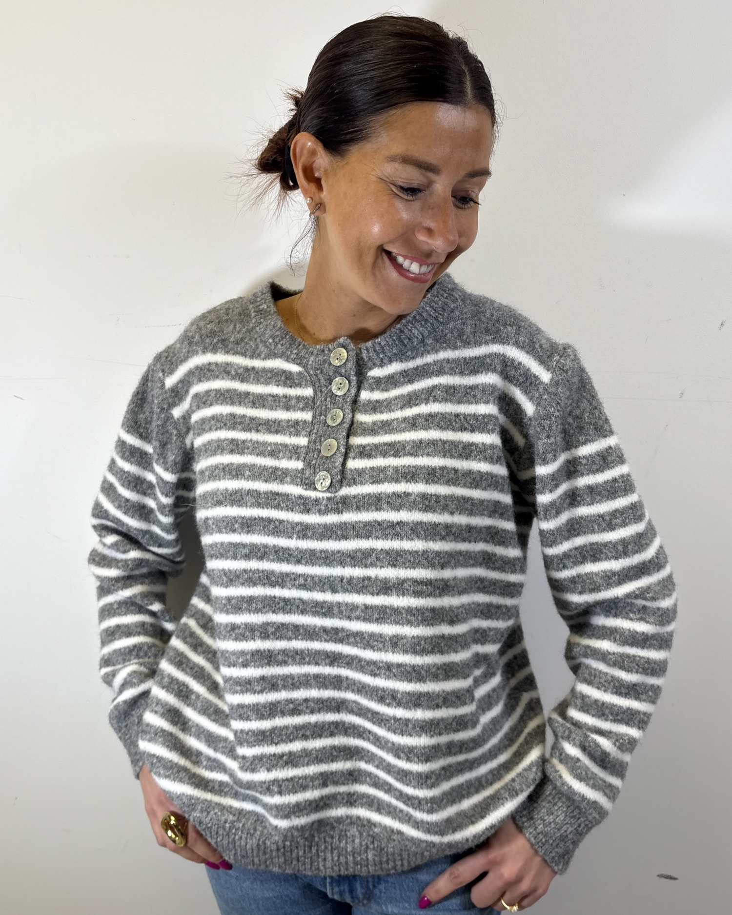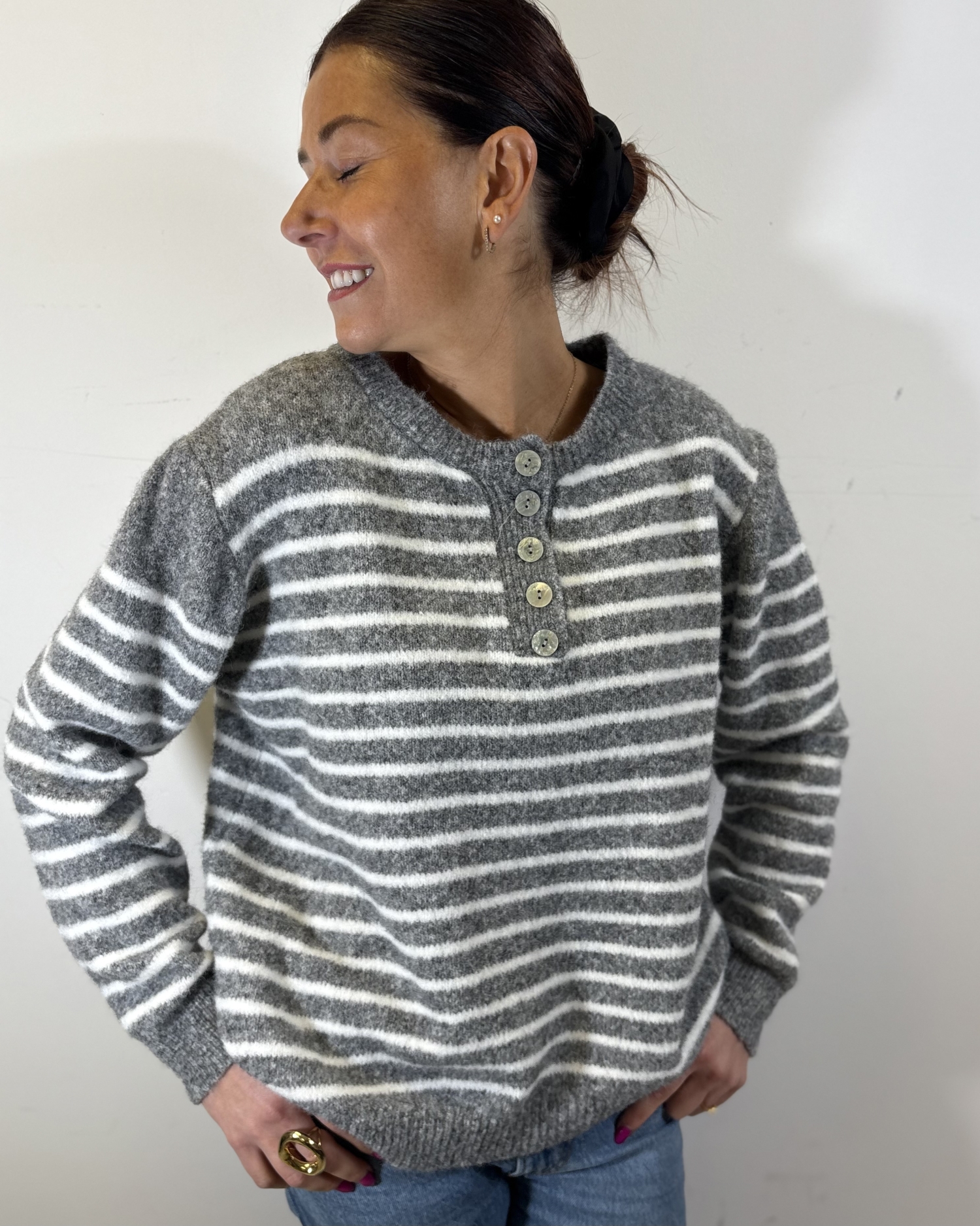 Le modèle est structuré par un col rond prolongé d’une patte de boutonnage ornée de boutons décoratifs, qui ajoutent une touche raffinée tout en permettant d’ajuster subtilement l’ouverture du col.