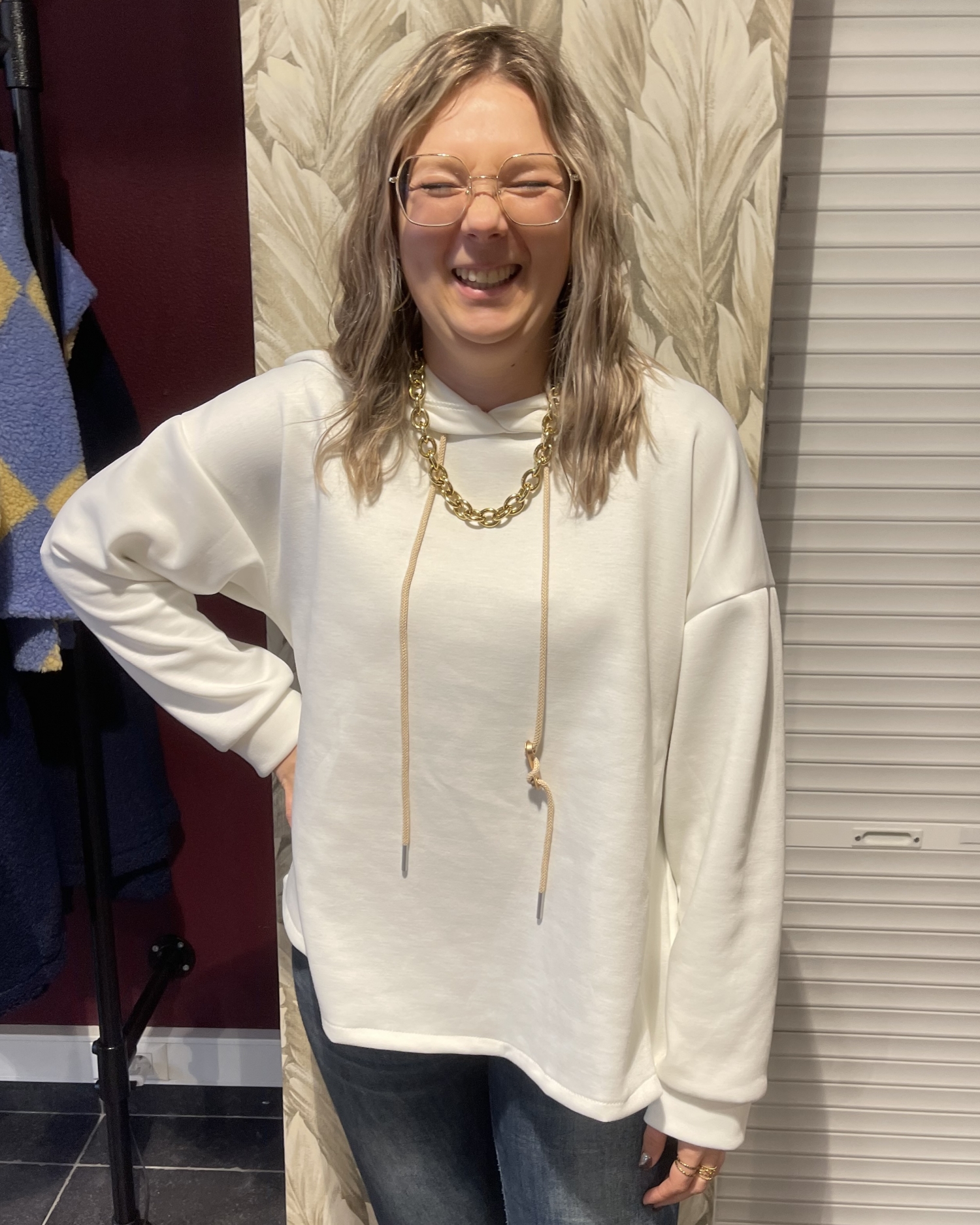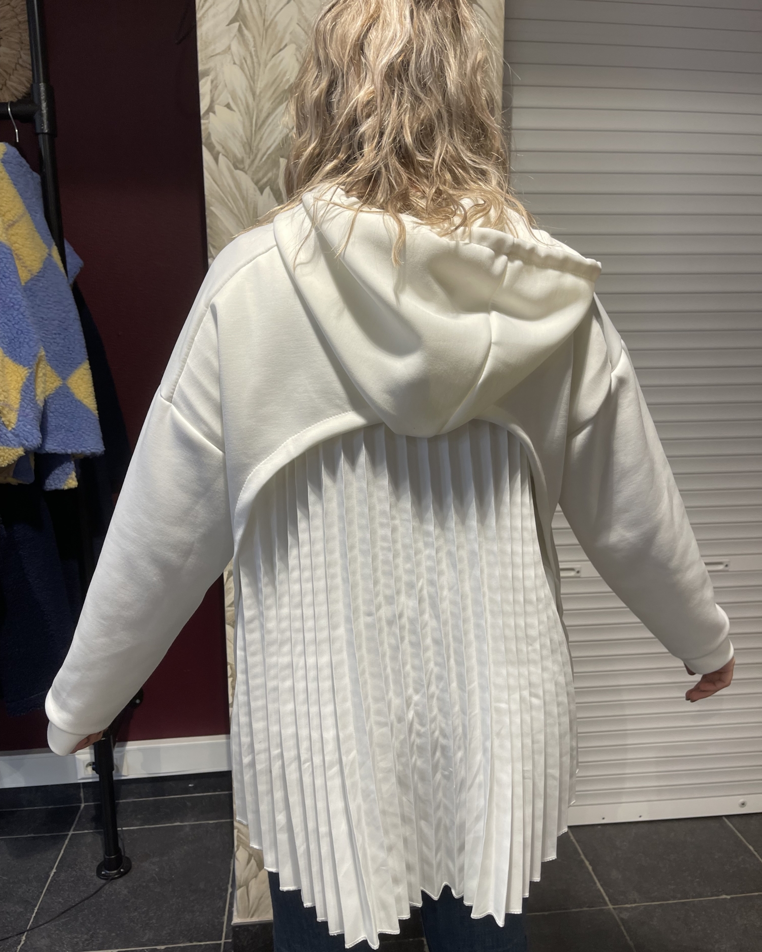 Sweat à capuche écru au style moderne et décontracté, doté d’une coupe ample avec épaules légèrement tombantes pour un tombé fluide et confortable. Il se distingue par son dos original composé d’un empiècement plissé qui apporte mouvement, élégance et une touche féminine inattendue à ce modèle casual revisité.
