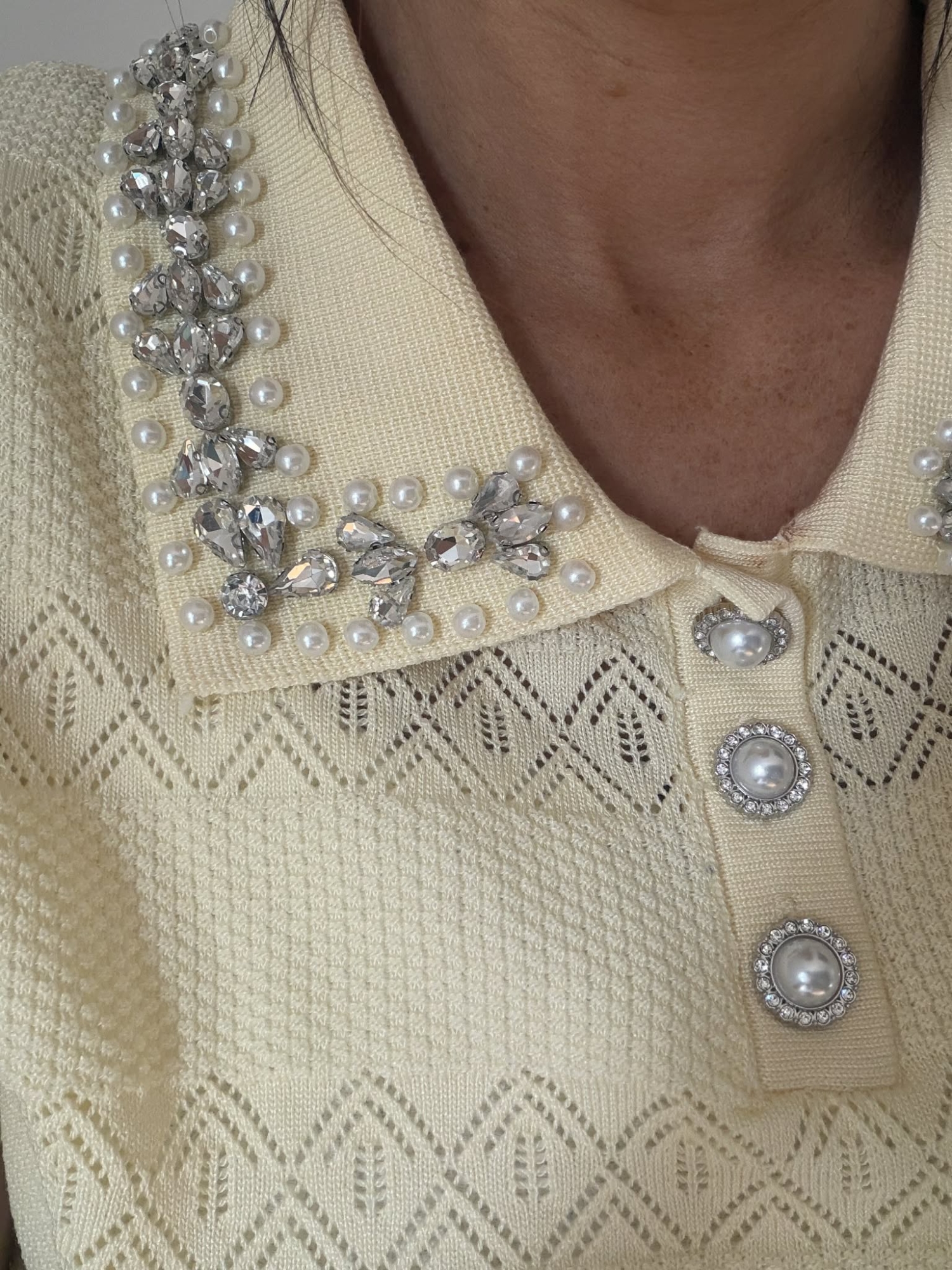 Son col polo est sublimé par de magnifiques détails en perles et strass, qui lui donnent un côté précieux et habillé.