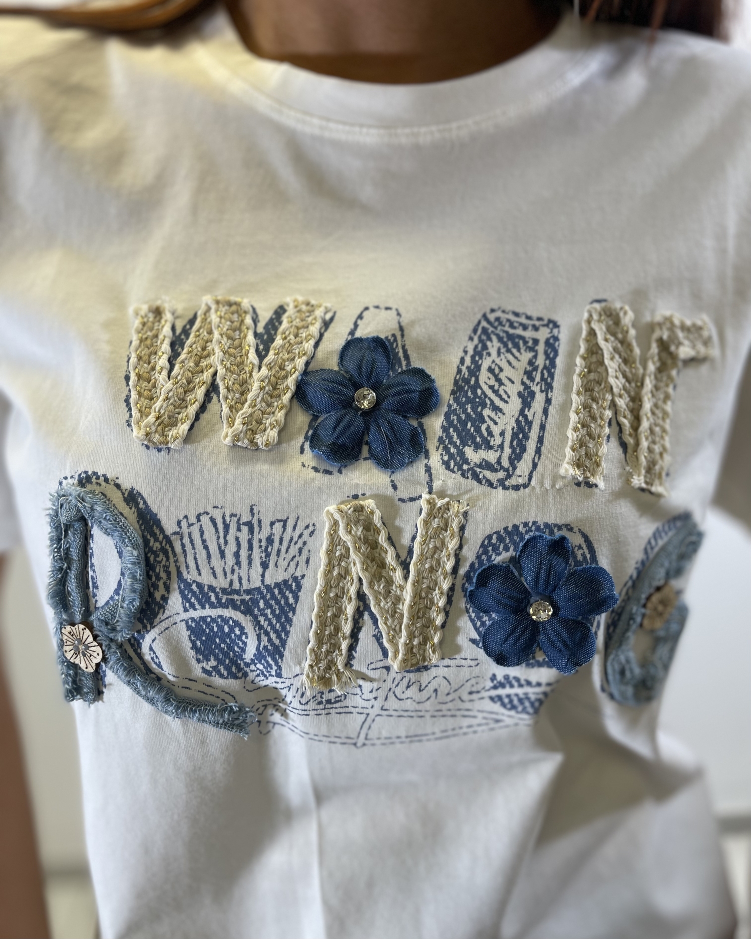 T-shirt à manches courtes et encolure ronde, à la coupe confortable et fluide. Il est sublimé par des détails en relief mêlant broderies texturées, applications en tissu et fleurs décoratives