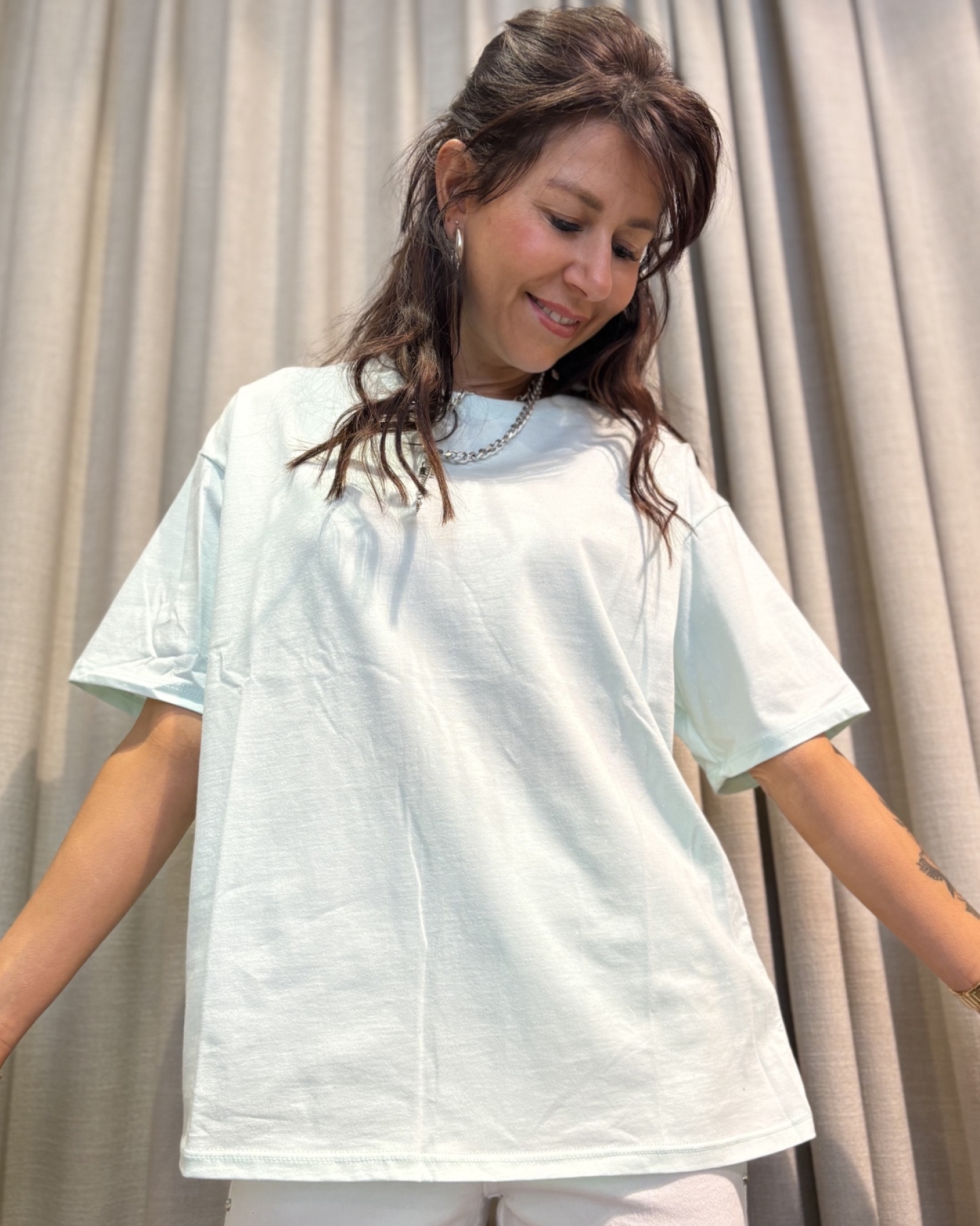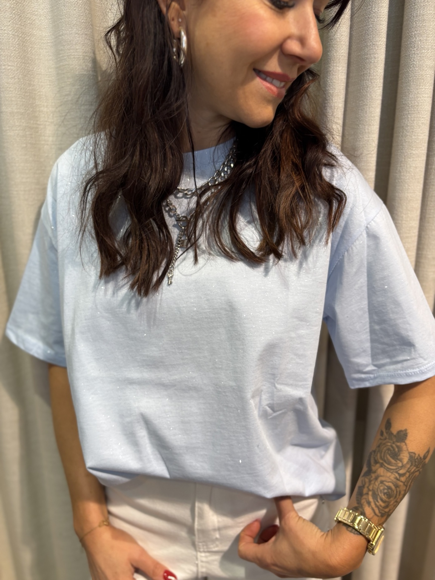 un t-shirt basique revisité avec une touche lumineuse et féminine. Sa coupe ample et confortable en fait une pièce facile à porter au quotidien. Son tissu est délicatement parsemé de petites paillettes discrètes qui apportent juste ce qu’il faut d’éclat. Un modèle simple, doux et facile à associer, parfait pour illuminer un look sans en faire trop.