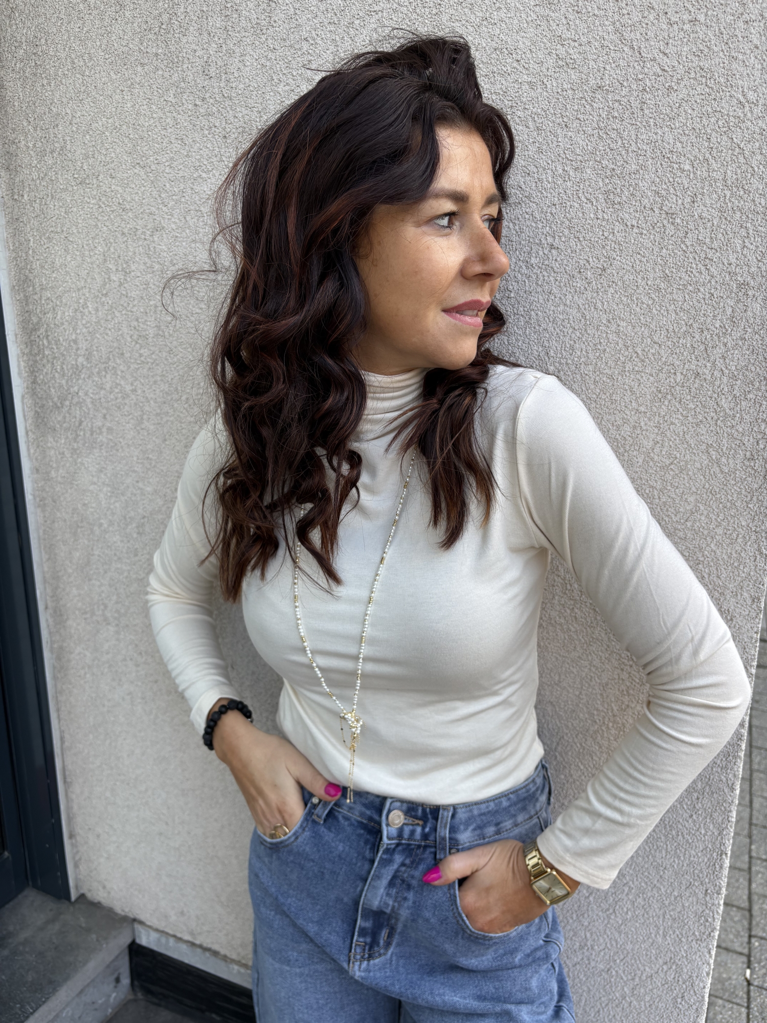Haut à col montant en maille douce, à la coupe ajustée qui épouse parfaitement la silhouette. Manches longues et matière fluide offrant un confort optimal tout au long de la journée. Son col légèrement montant apporte une touche élégante et moderne, facile à porter seul ou sous une veste.