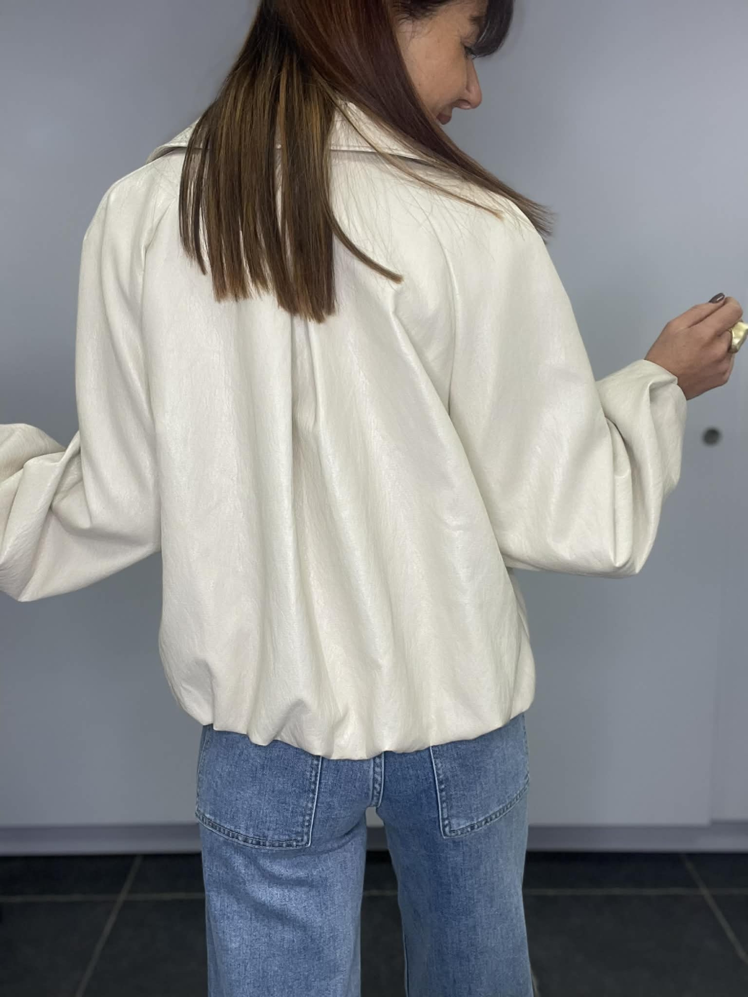 Cette veste courte au coloris crème apporte immédiatement une touche chic et lumineuse à la tenue. Son effet cuir souple lui donne un look moderne tout en restant très confortable à porter.