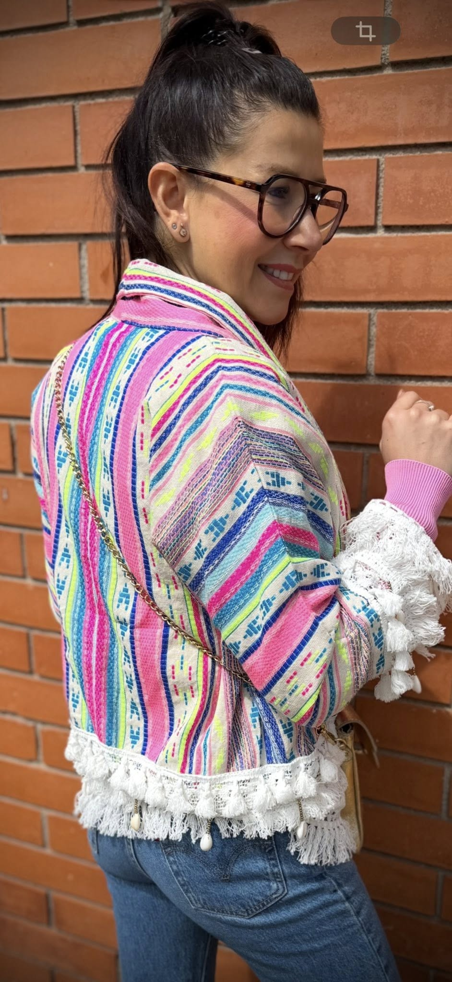 Cette veste courte a beaucoup de caractère, avec un esprit bohème et ultra coloré. Elle se distingue par son tissu à rayures multicolores mêlant du rose, du bleu, du turquoise, du jaune fluo et des touches écrues, pour un rendu lumineux et original.