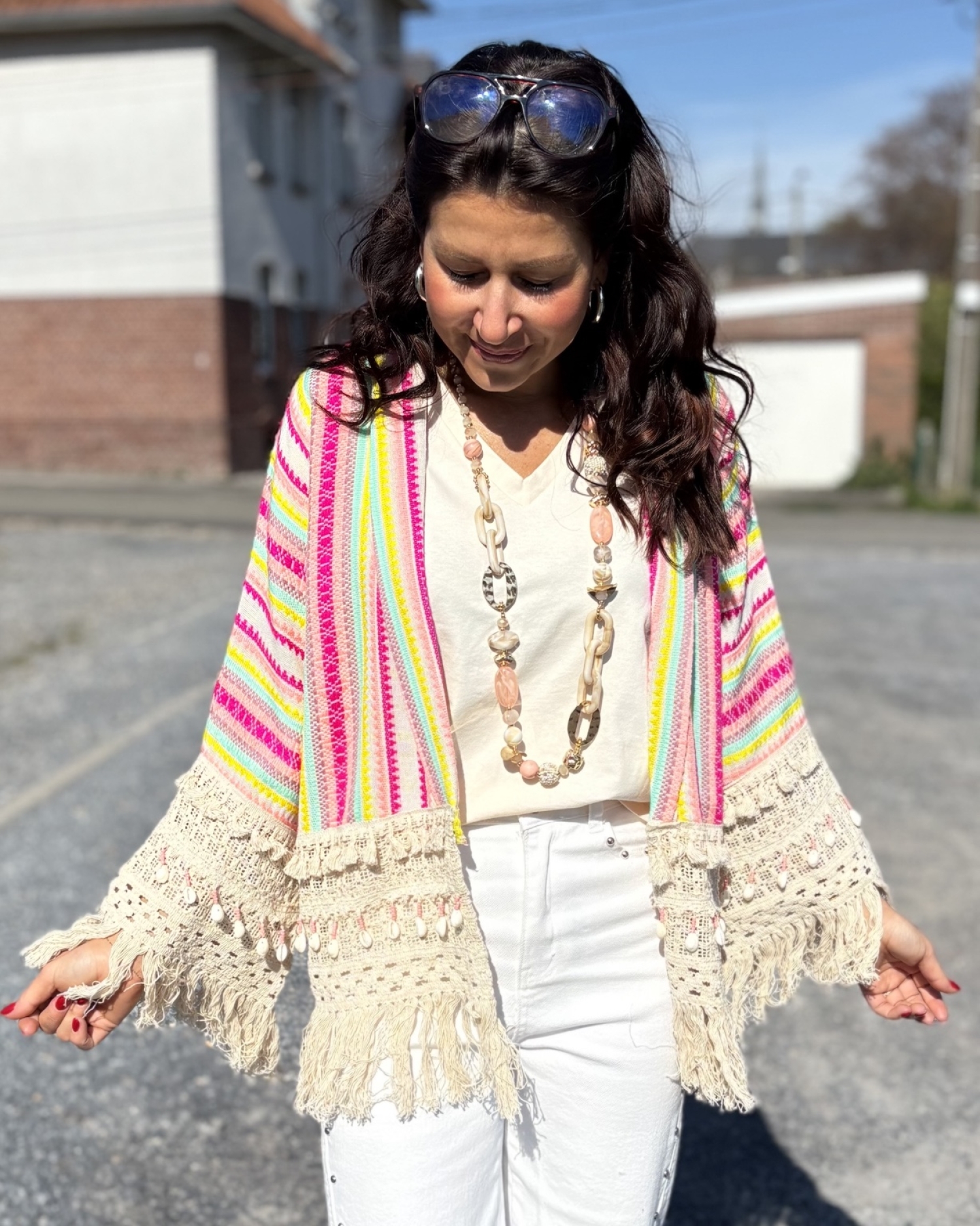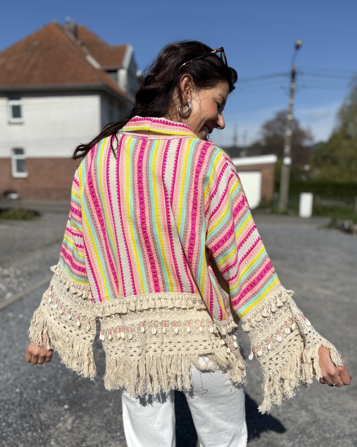Veste courte au style bohème et solaire, ornée de rayures multicolores dans des tons rose, jaune, vert d’eau et écru. Sa coupe ouverte et fluide la rend facile à superposer, tandis que les manches larges apportent une belle allure décontractée. Les finitions en crochet beige, les franges longues et les petits coquillages ajoutent une touche artisanale et estivale pleine de charme. Une pièce lumineuse et originale, parfaite pour donner du peps à un look simple.