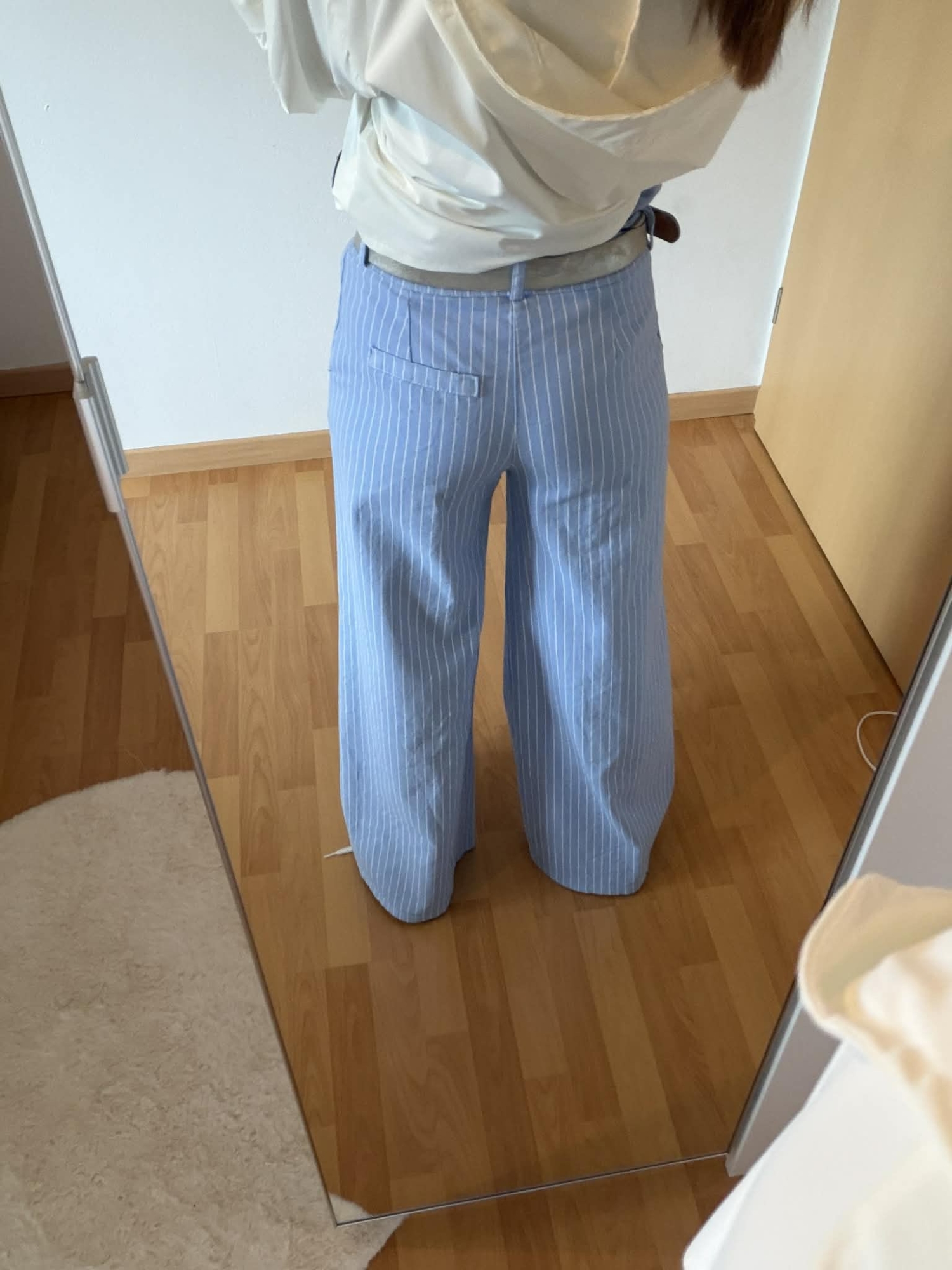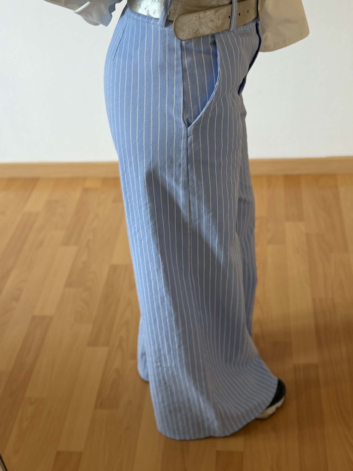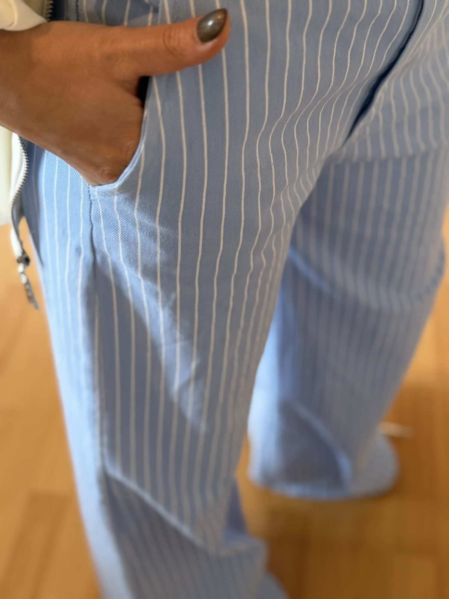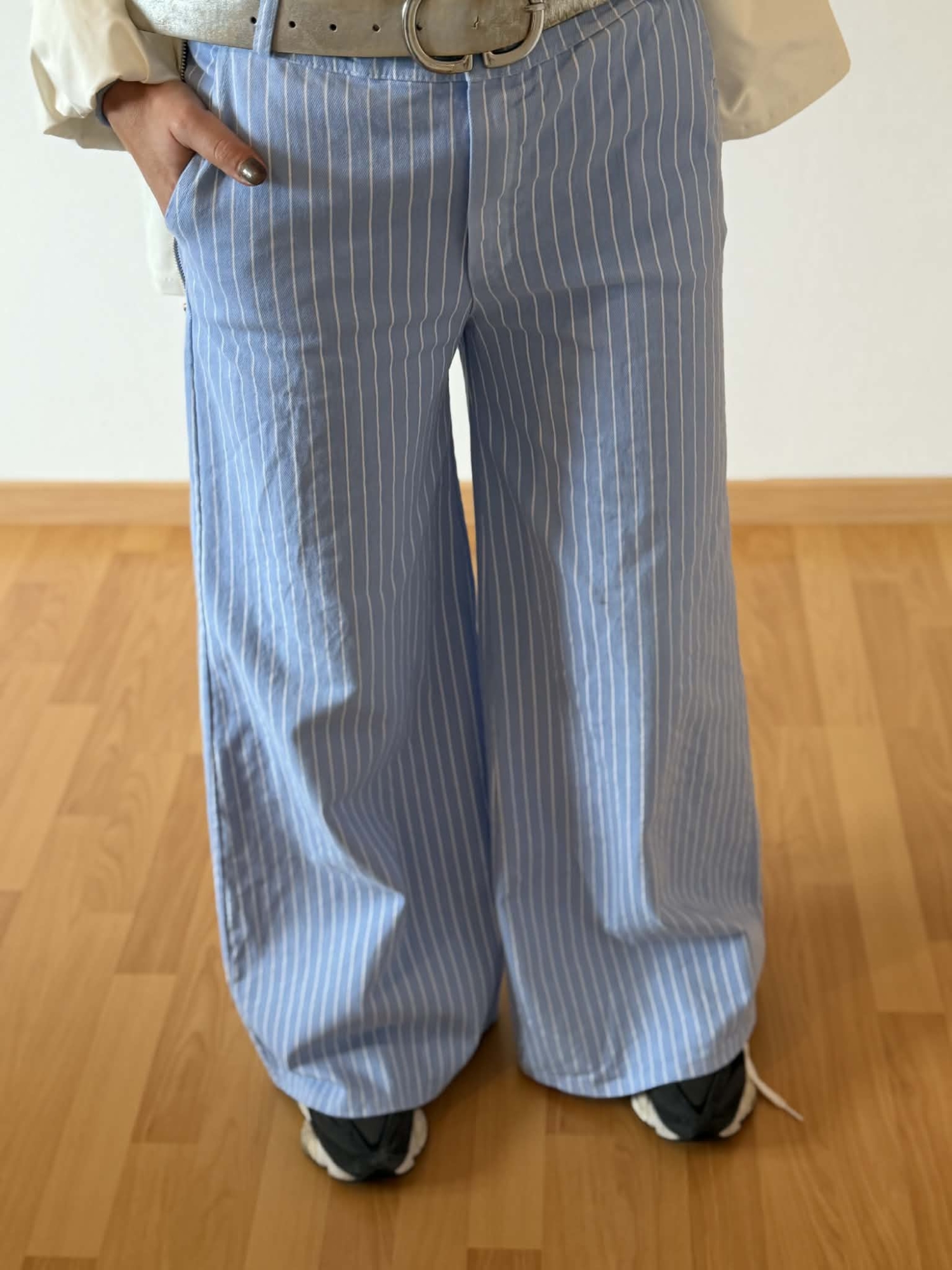 Pantalon fluide bleu ciel à fines rayures blanches, parfait pour une silhouette élancée et ultra tendance. On aime sa taille haute flatteuse, sa coupe large qui tombe joliment sur la jambe et son esprit à la fois chic et décontracté.
