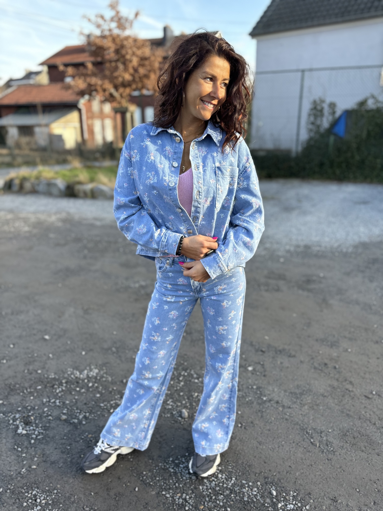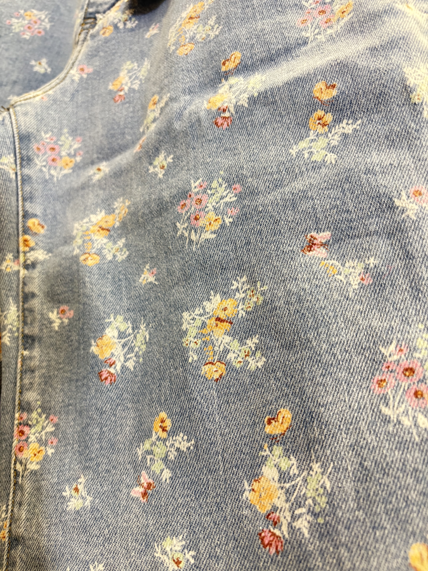 Jean en denim bleu clair délavé, rehaussé d’un imprimé petites fleurs pastel all-over pour une touche romantique. Coupe droite confortable, taille classique