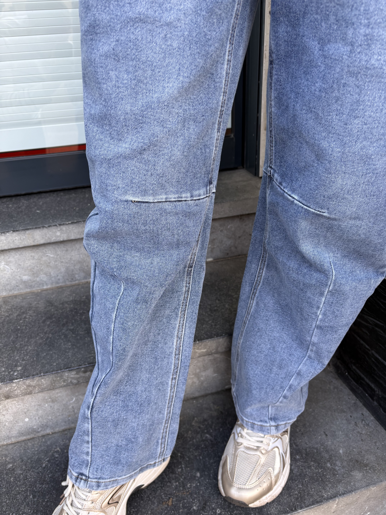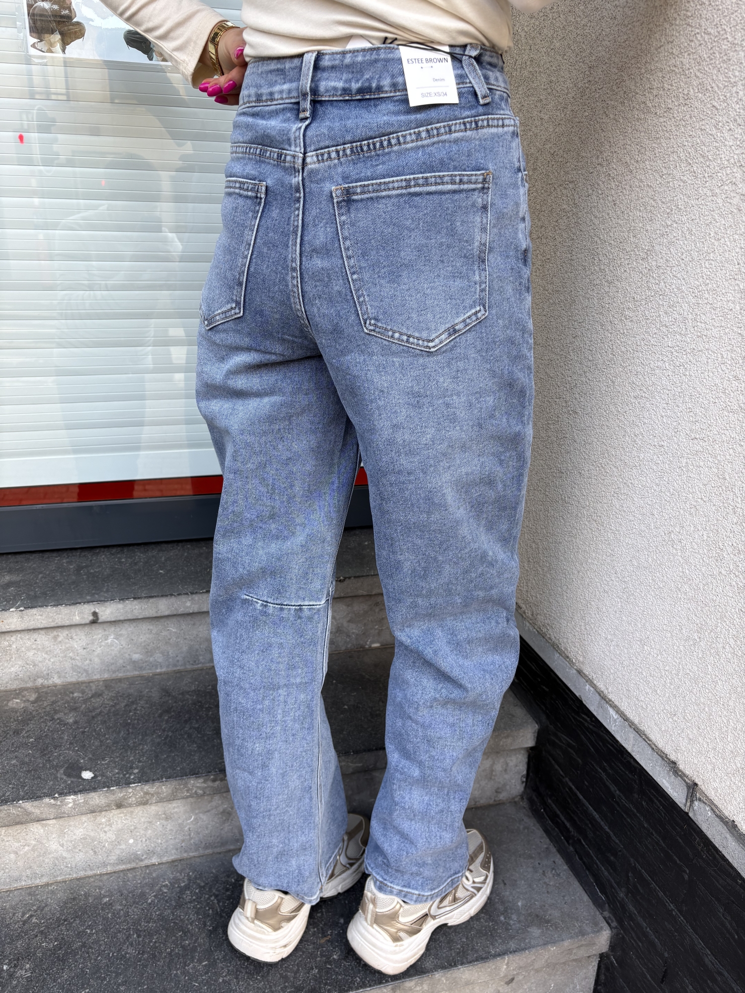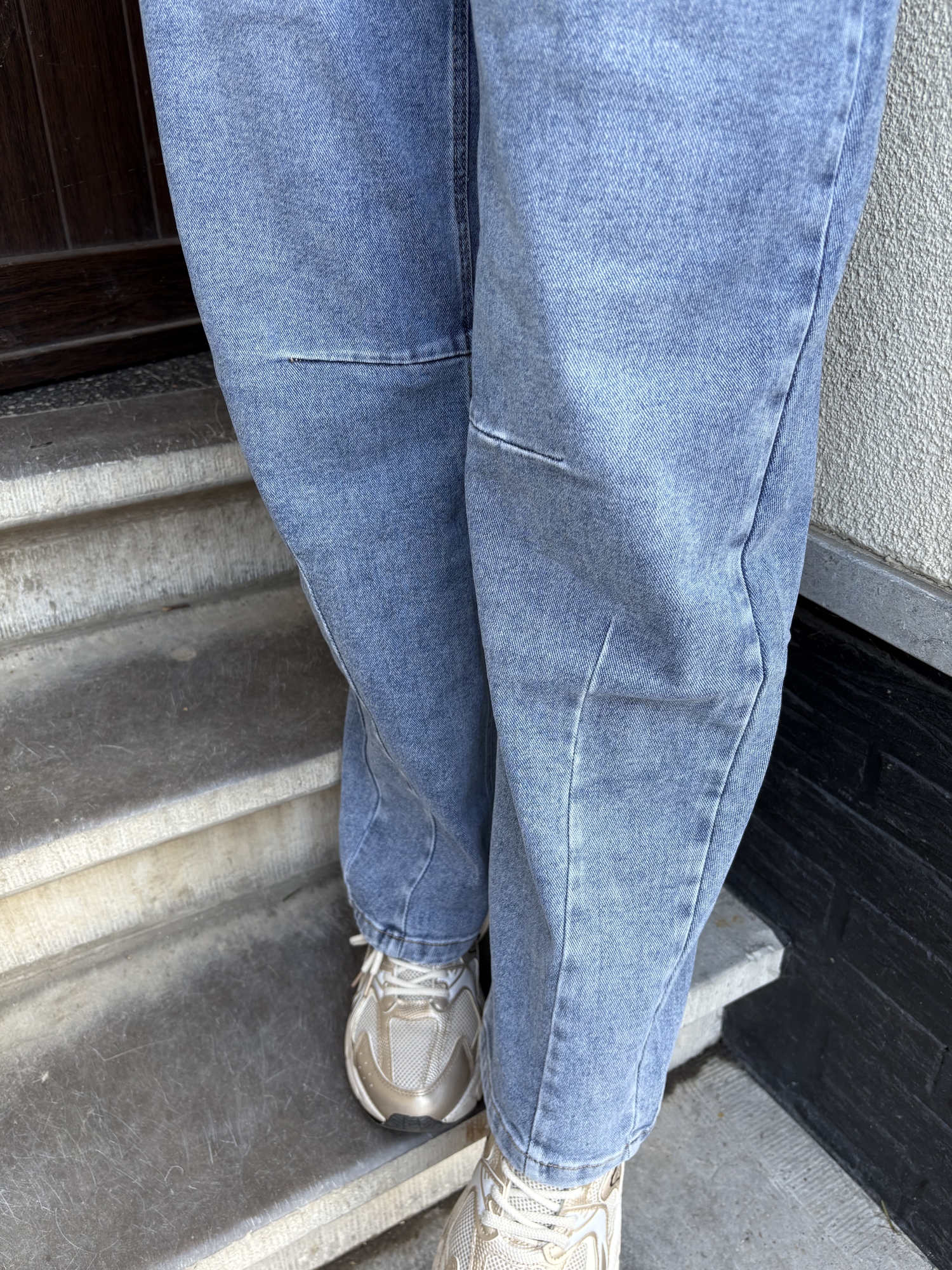 Pantalon en denim bleu à la coupe droite légèrement évasée, idéal pour une silhouette moderne et confortable. Taille haute structurée qui affine la taille et met en valeur les hanches