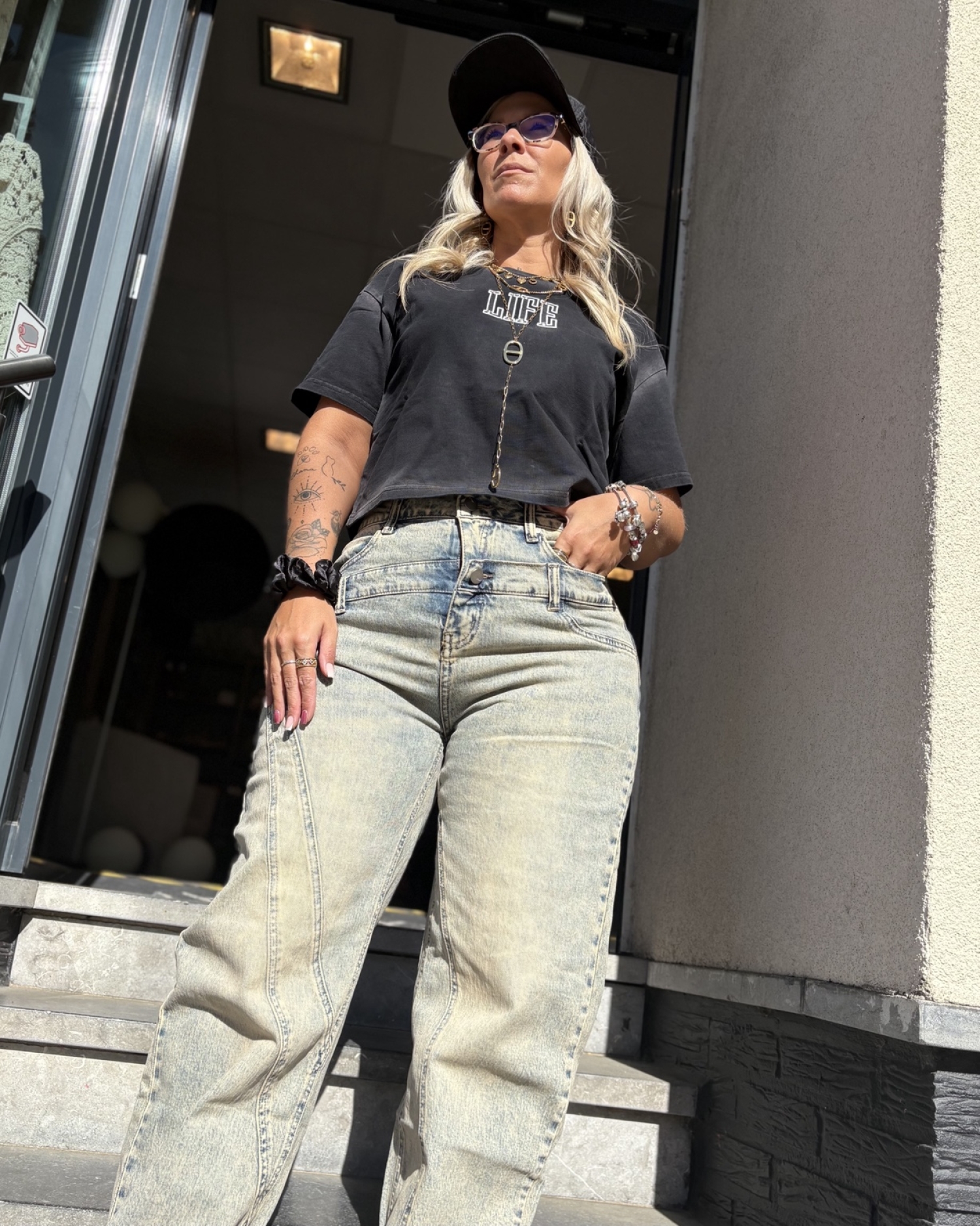 Jean au style loose et tendance, à la coupe droite légèrement ample pour un tombé décontracté. Taille haute, avec passants pour ceinture, poches avant et arrière, et une fermeture classique par bouton et zip. Sa toile denim effet délavé lui donne un look vintage très mode, facile à associer avec un t-shirt, un blazer ou une blouse plus habillé