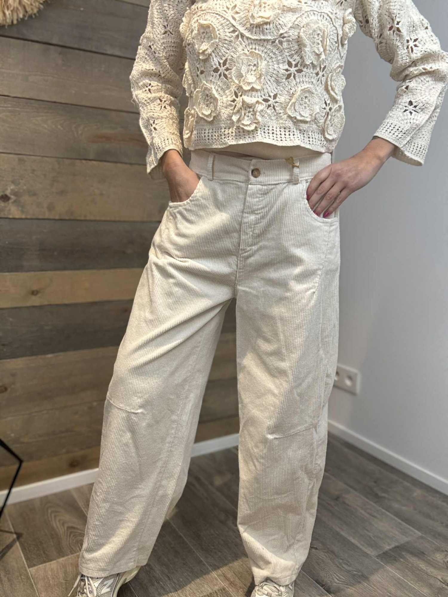 Pantalon à la coupe droite et ample, pensé pour un tombé fluide et confortable. Il se porte taille haute, ce qui structure joliment la silhouette tout en restant agréable au quotidien. La matière présente un léger relief côtelé qui apporte du caractère et une touche tendance.