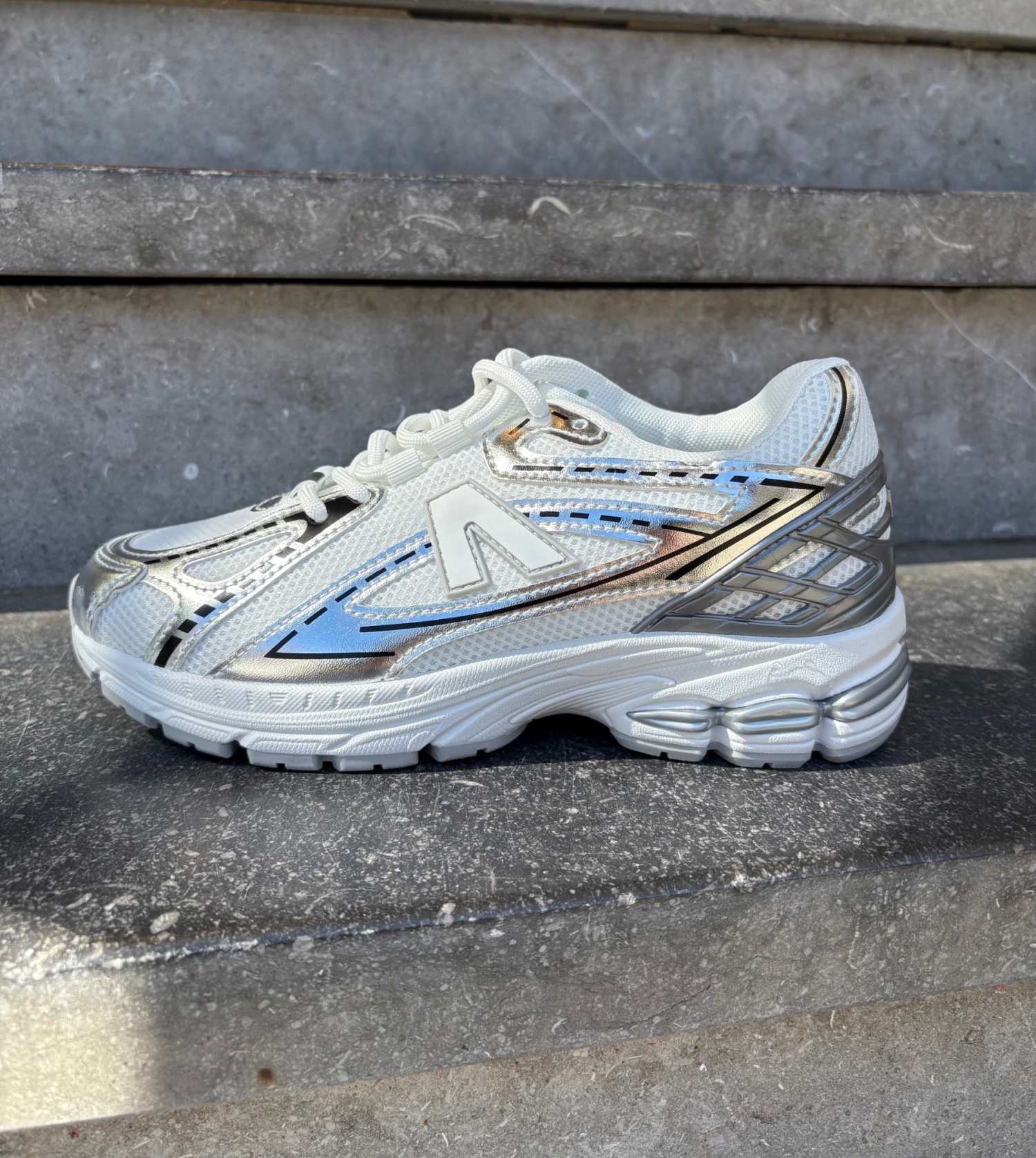 Ces baskets au style rétro-running mixent une base blanche en maille respirante avec de jolis empiècements argentés brillants. Leur semelle épaisse apporte un look tendance et confortable, tandis que les détails graphiques noirs et métallisés renforcent leur allure moderne et dynamique. Une paire facile à porter, parfaite pour donner du caractère à une tenue tout en restant lumineuse et actuelle.