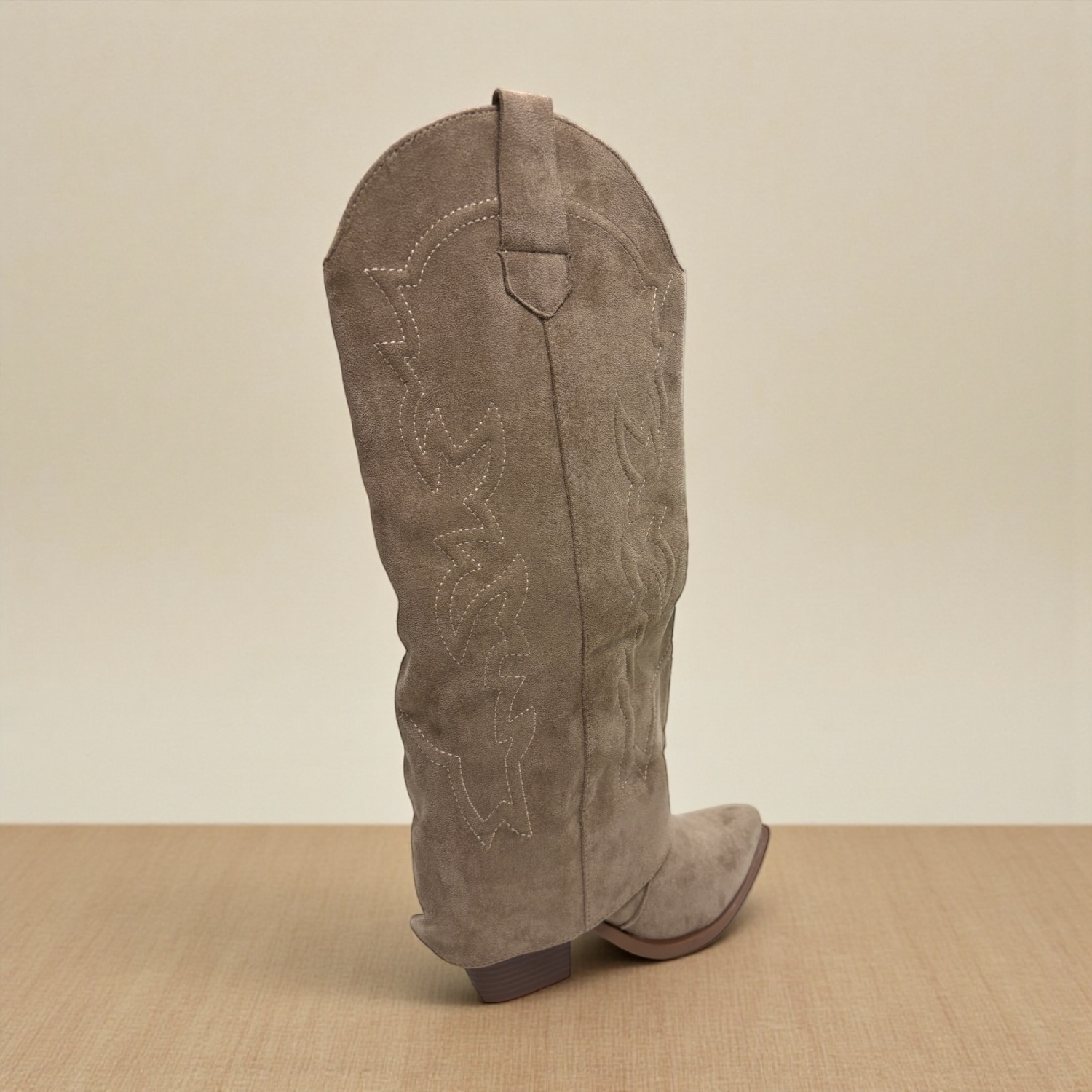 Botte western “Victoria” en suédine couleur sable, parfaite pour apporter une touche bohème chic à tous tes looks.