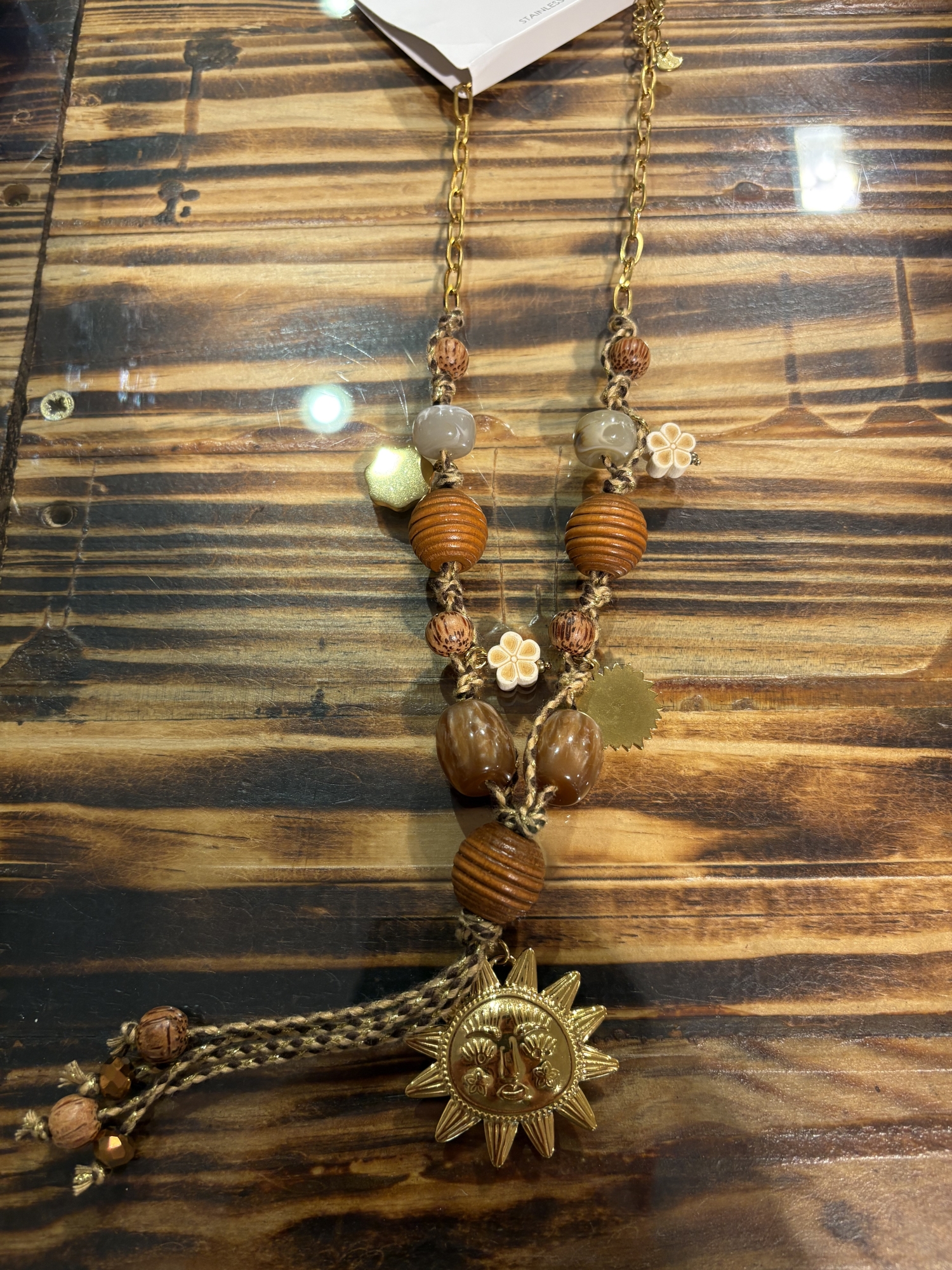 Collier au style bohème chic, composé d’un assemblage harmonieux de perles texturées et de pendentifs travaillés. Sa pièce centrale en forme de soleil apporte caractère et lumière à la tenue, tandis que les petites breloques ajoutent une touche délicate et féminine.