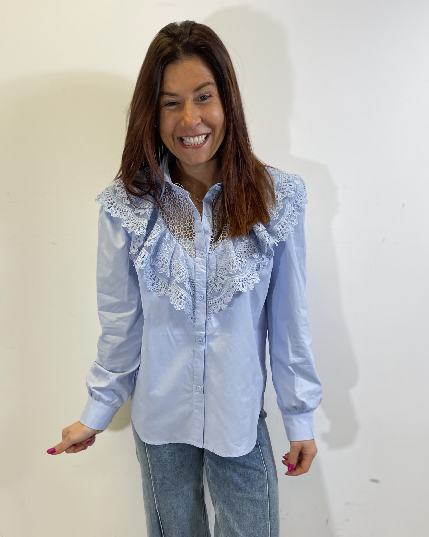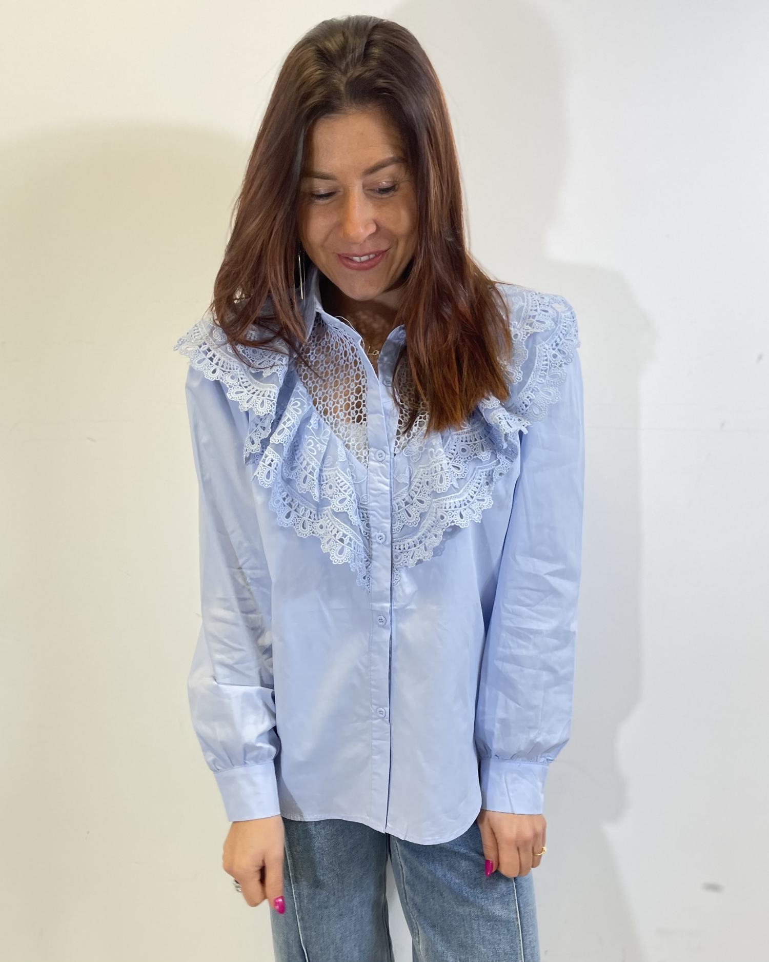 Chemise élégante à manches longues, coupe fluide et légèrement structurée, fermée par une patte de boutonnage classique. Le haut est sublimé par un large empiècement en dentelle ajourée formant un plastron décoratif avec volants délicats, apportant une touche romantique et sophistiquée à la silhouette.